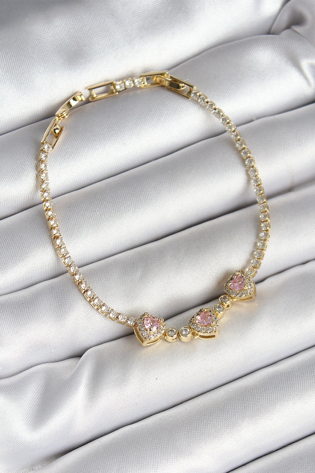 Erb Pirinç Sıralı Pembe Kalp Figürlü Zirkon Taşlı Gold Renk Kadın Bileklik