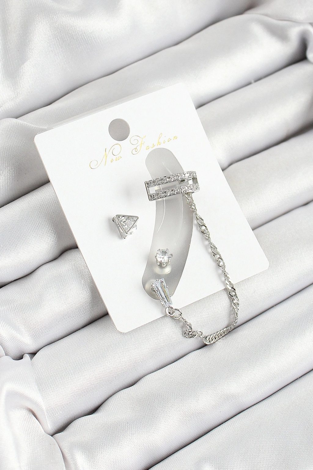 Erb Pirinç Üçgen Figürlü Zirkon Taşlı Gümüş Renk 3'lü Kıkırdak Kadın Küpe Set