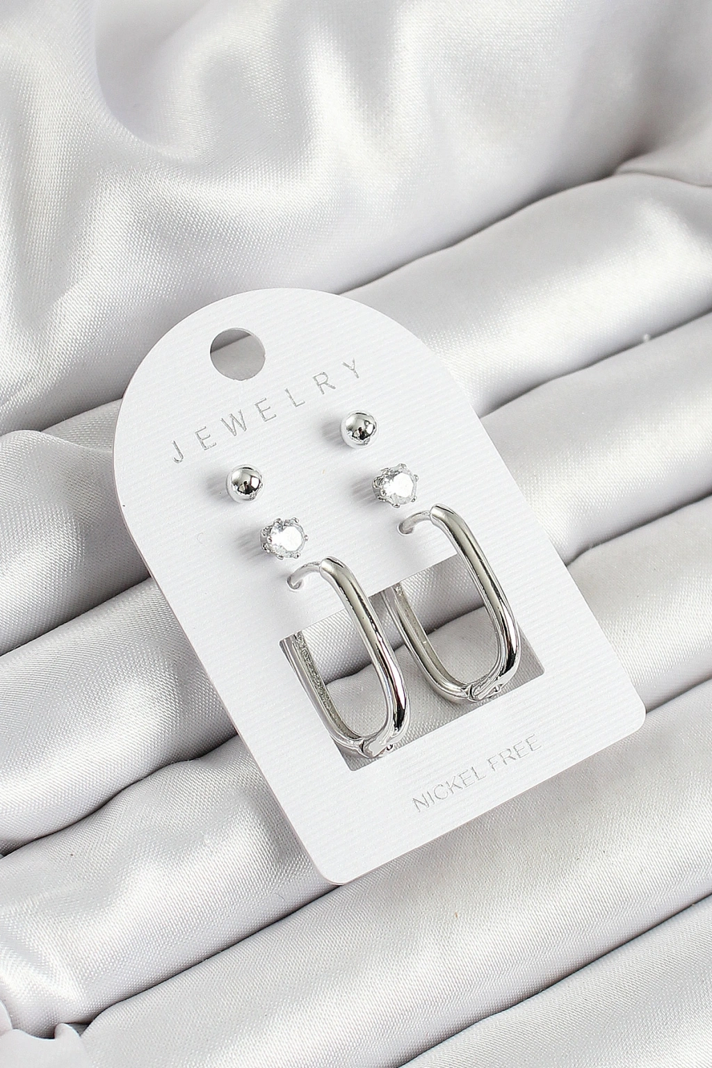 Erb Pirinç Zirkon Taş Ve Dikdörtgen Figürlü Gümüş Renk 3'lü Çift Kadın Küpe Set