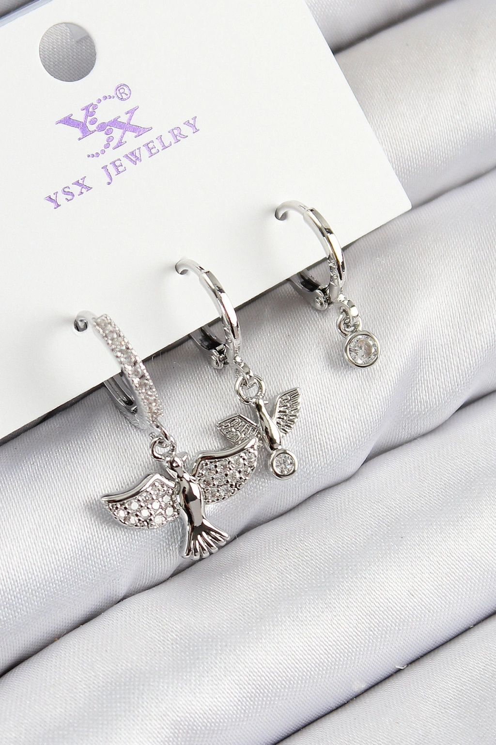 Erb Pirinç Zirkon Taşlı 3'lü Kuş Model Gümüş Renk Kadın Küpe