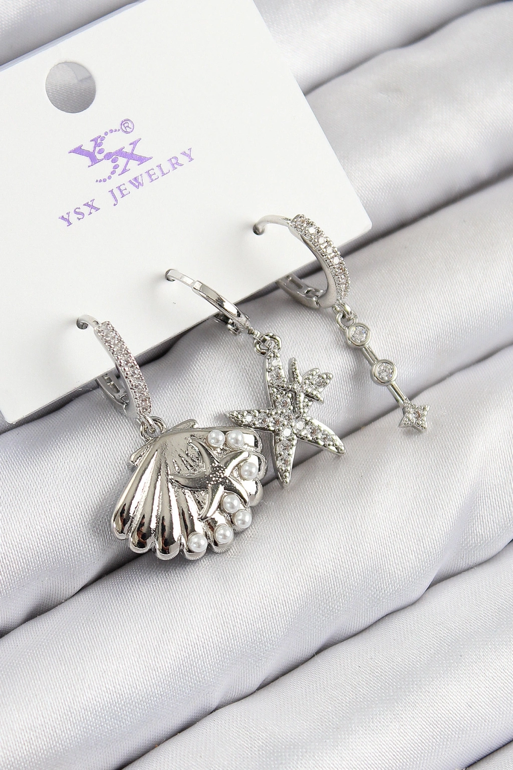 Erb Pirinç Zirkon Taşlı 3'lü Yıldız Ve İstiridye Model Gümüş Renk Kadın Küpe