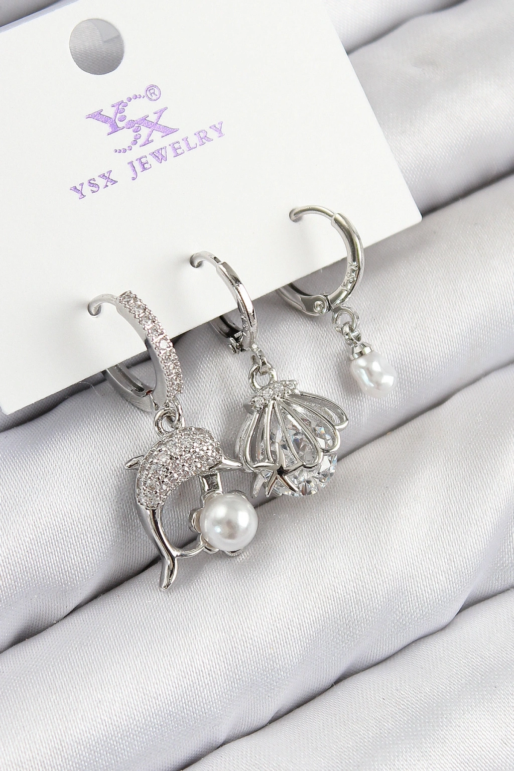 Erb Pirinç Zirkon Taşlı 3'lü Yunus Balığı Ve İstiridye Model Gümüş Renk Kadın Küpe