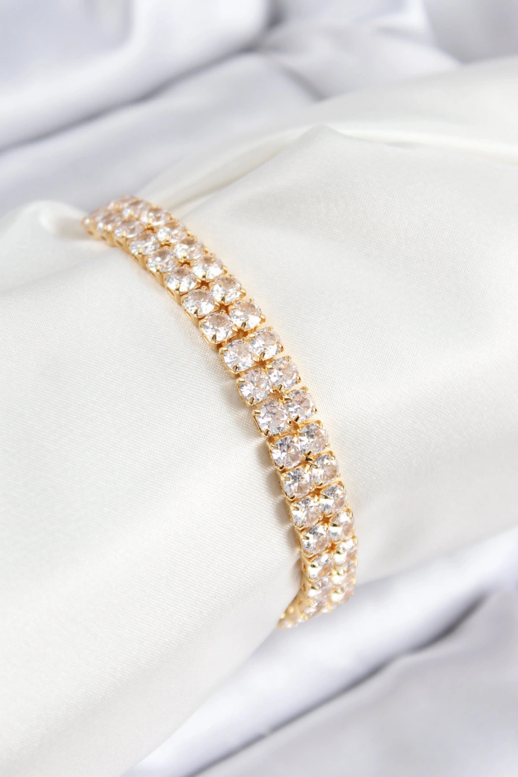 Erb Pirinç Zirkon Taşlı Çift Sıra Kare Model Gold Renk Asansörlü Kadın Bileklik