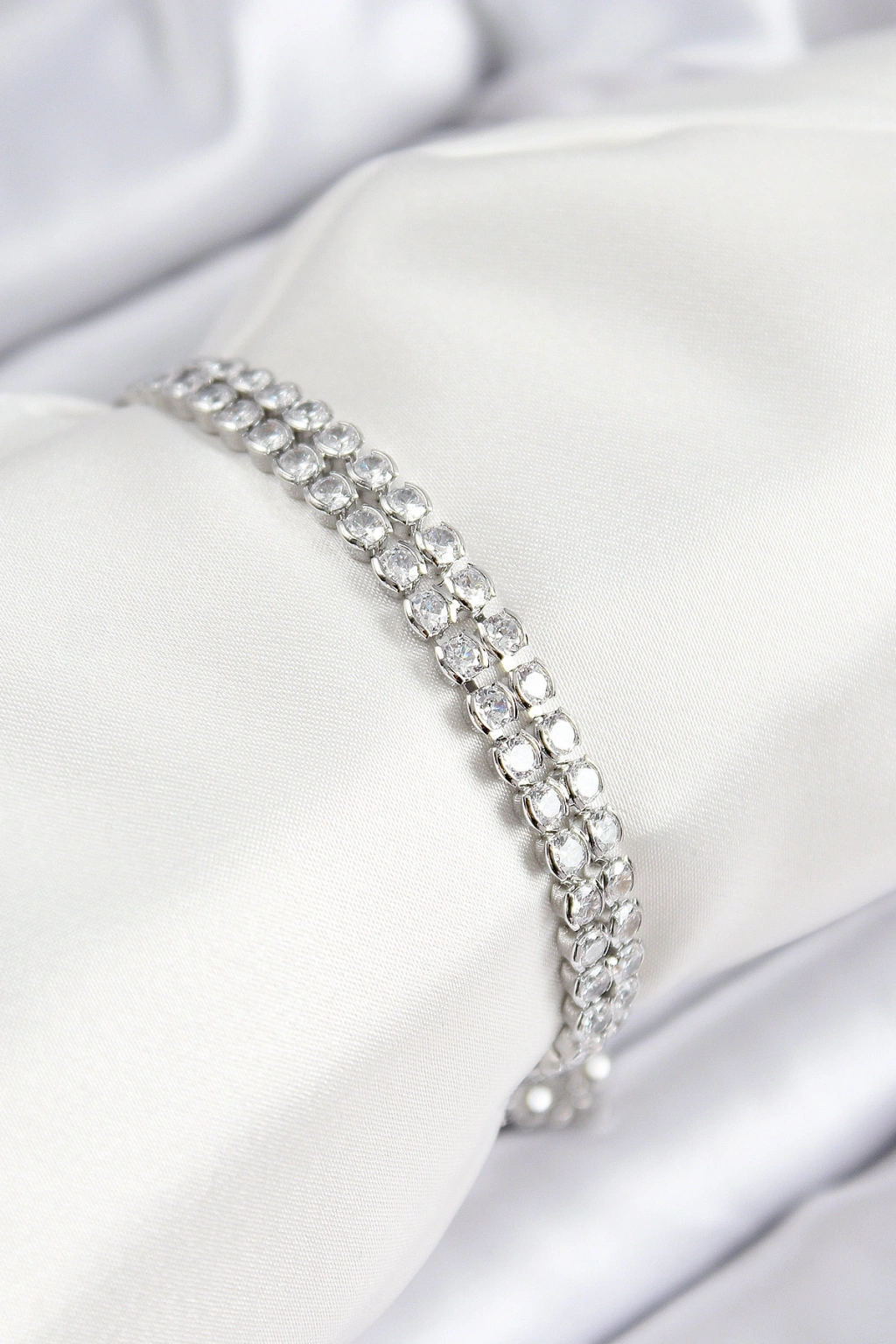 Erb Pirinç Zirkon Taşlı Çift Sıra Model Gümüş Renk Asansörlü Kadın Bileklik