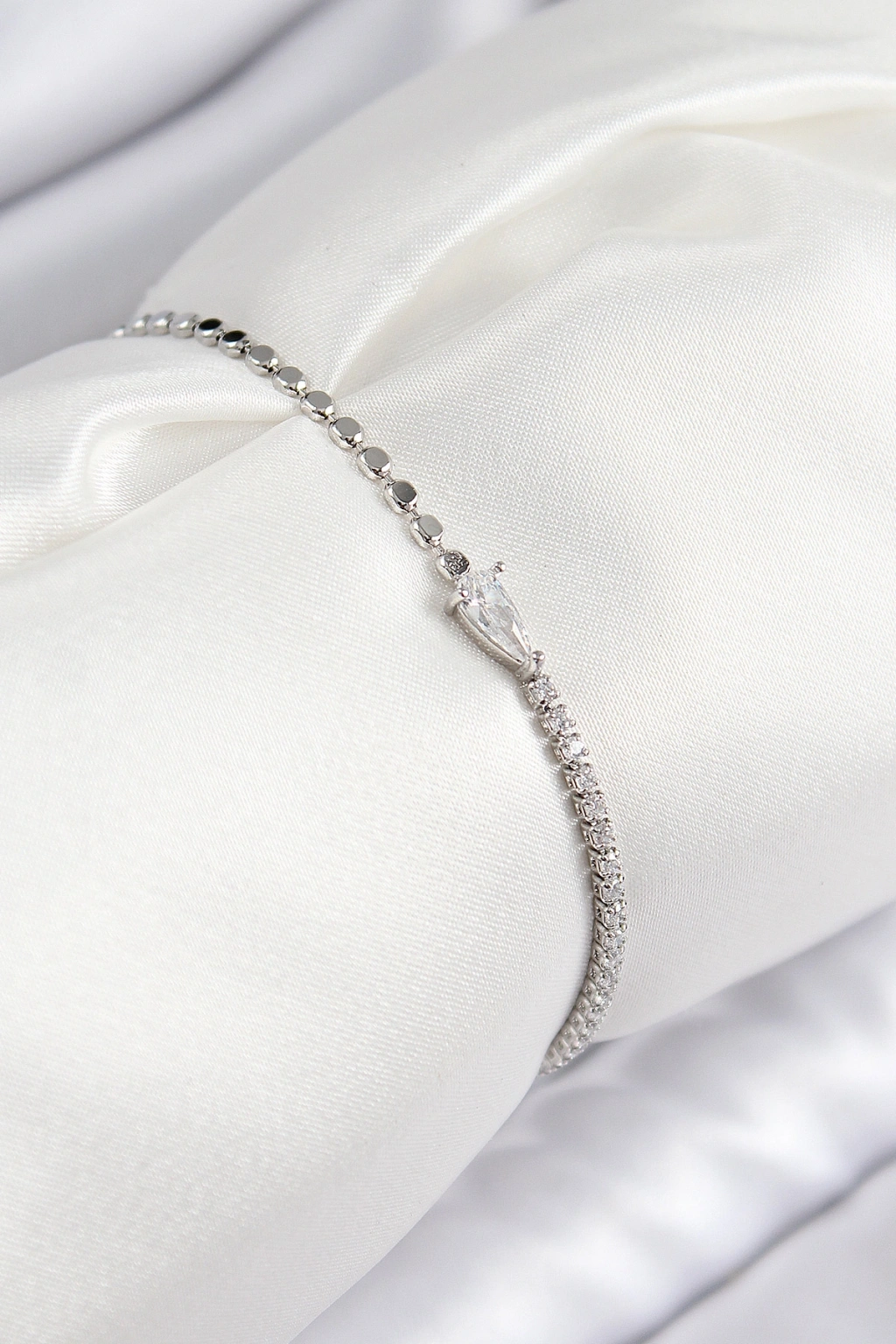 Erb Pirinç Zirkon Taşlı Damla Model Ezme Zincir Gümüş Renk Kadın Bileklik