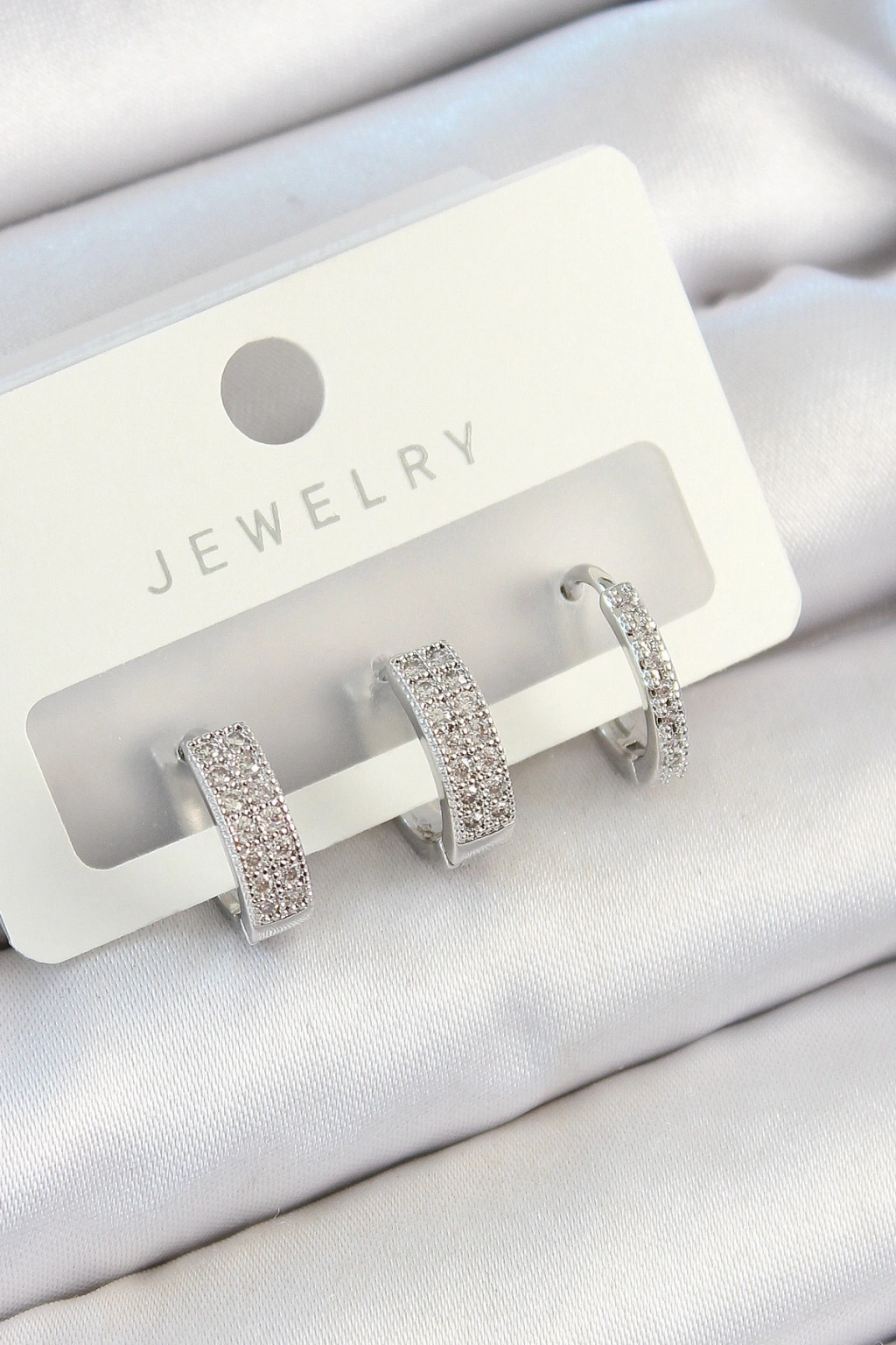 Erb Pirinç Zirkon Taşlı Halka Model Gümüş Renk 3'lü Çift Kadın Küpe Set
