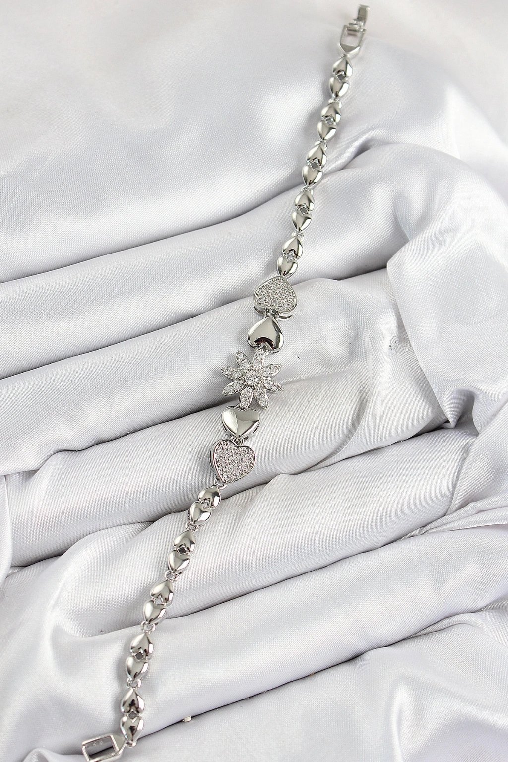 Erb Pirinç Zirkon Taşlı Kalp Detaylı Çiçek Model Gümüş Renk Kadın Bileklik