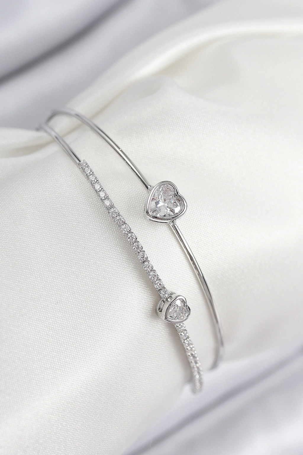 Erb Pirinç Zirkon Taşlı Kalp Model Gümüş Renk Kadın Bileklik