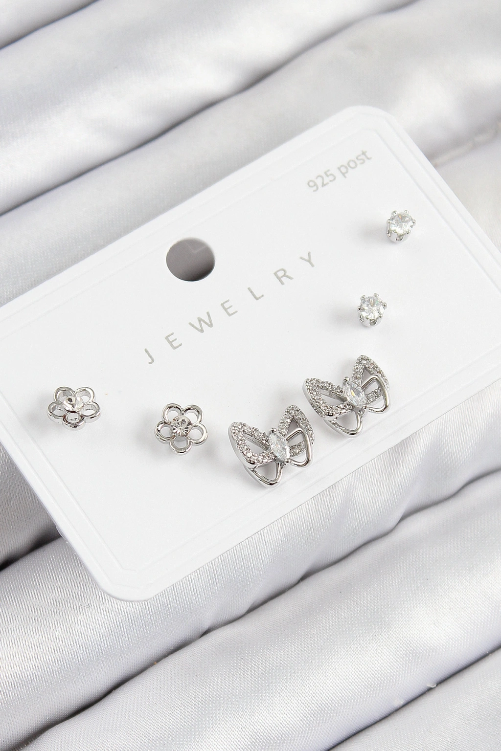 Erb Pirinç Zirkon Taşlı Kelebek Model Gümüş Renk 925 Ayar Gümüş Çivi Kadın Küpe Set