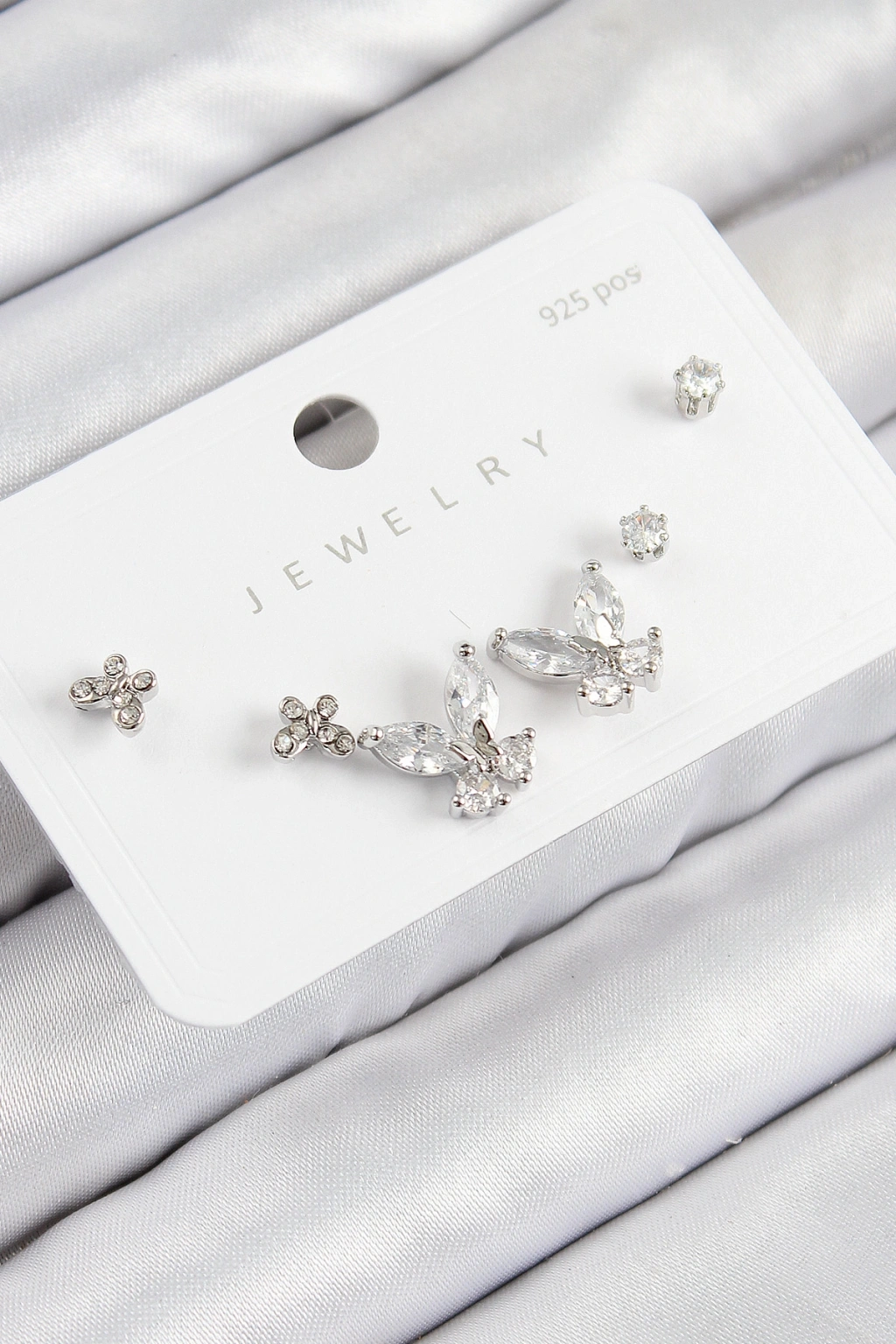 Erb Pirinç Zirkon Taşlı Kelebek Model Gümüş Renk 925 Ayar Gümüş Çivi Kadın Küpe Set