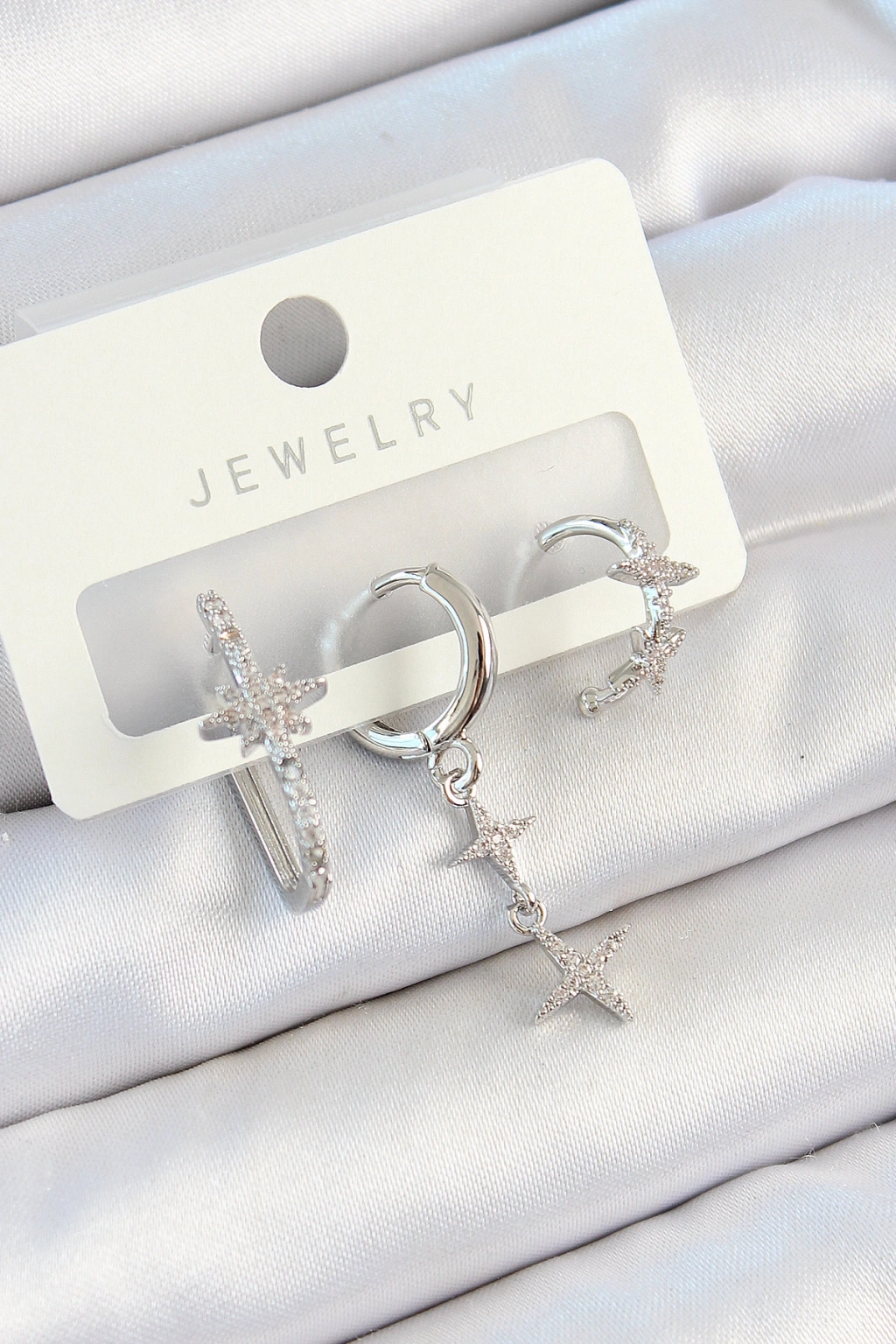 Erb Pirinç Zirkon Taşlı Kelebek Ve Sallantılı Yıldız Model Gümüş Renk 3'lü Çift Kadın Küpe Set