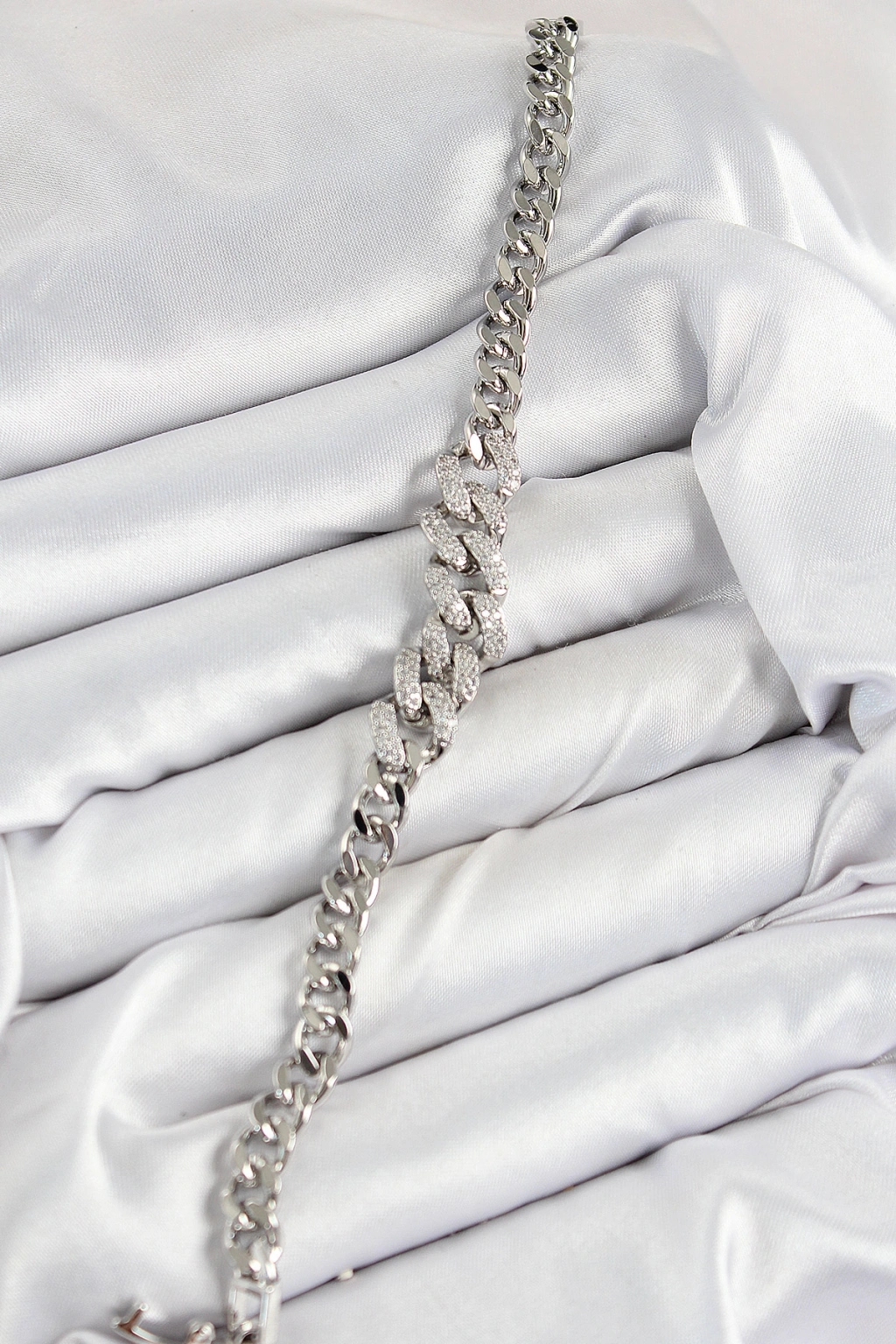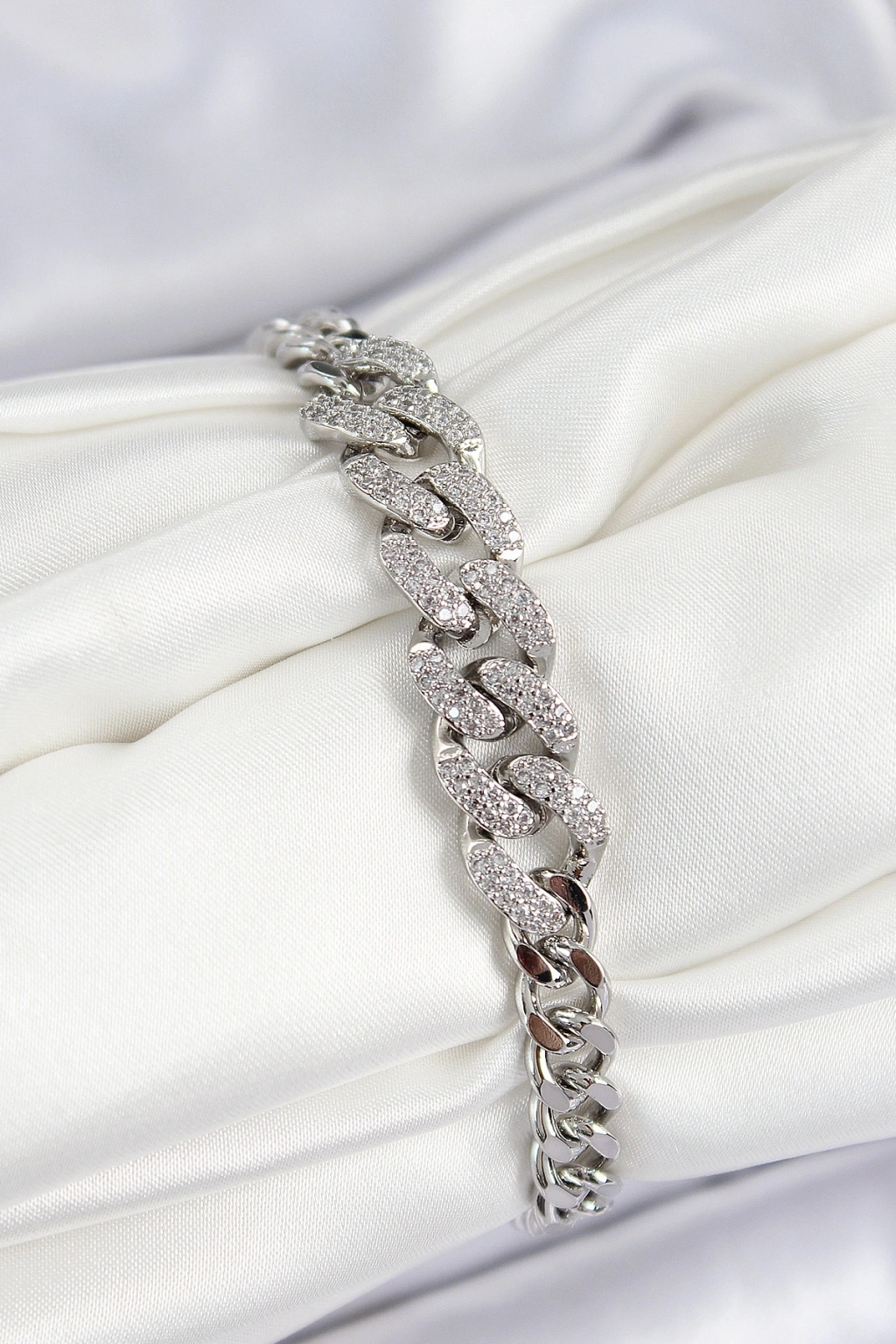 Erb Pirinç Zirkon Taşlı Küba Zincir Model Gümüş Renk Kadın Bileklik