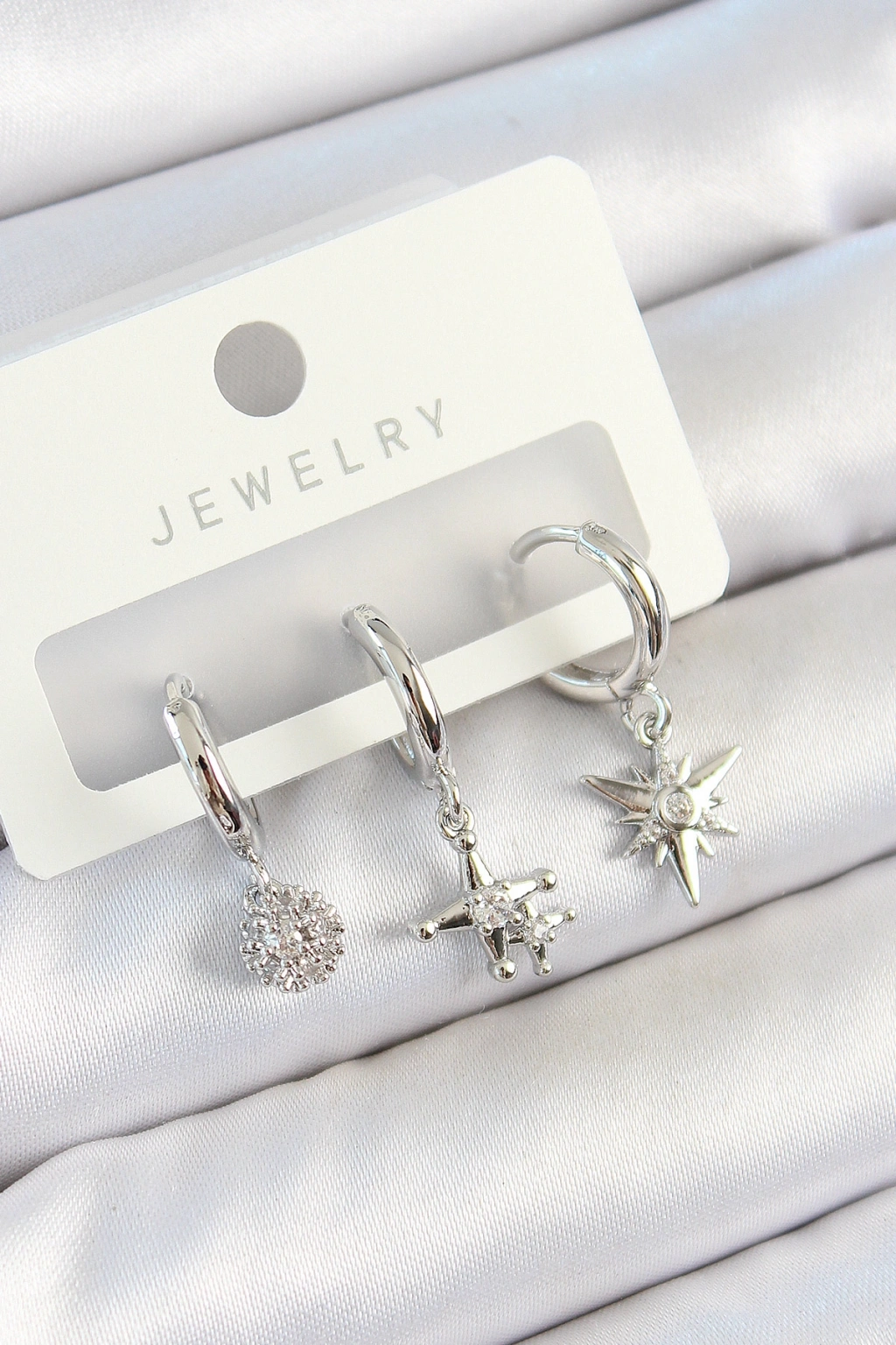 Erb Pirinç Zirkon Taşlı Kutup Yıldızı Model Gümüş Renk 3'lü Çift Kadın Küpe Set