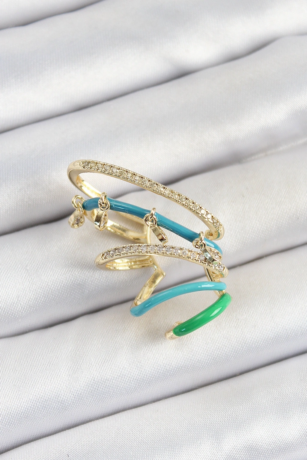 Erb Pirinç Zirkon Taşlı Mavi Yeşil Sıkıştırma Sağ Kıkırdak Gold Renk Kadın Küpe