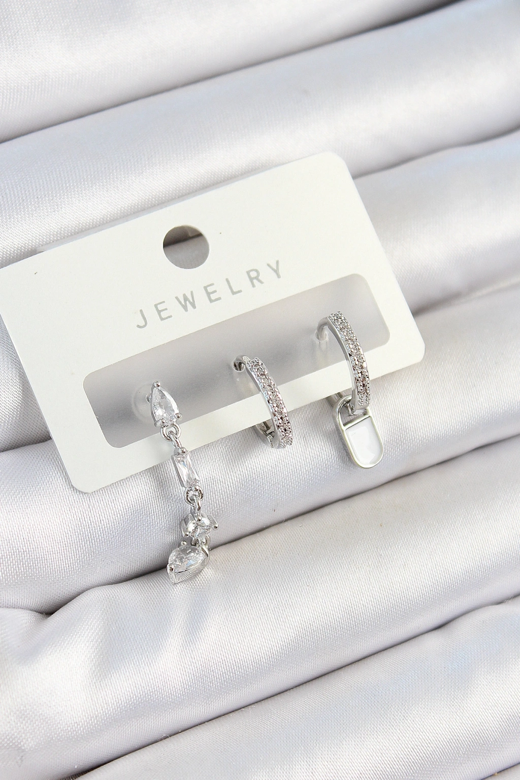 Erb Pirinç Zirkon Taşlı Sallantılı Model Gümüş Renk 3'lü Çift Kadın Küpe Set
