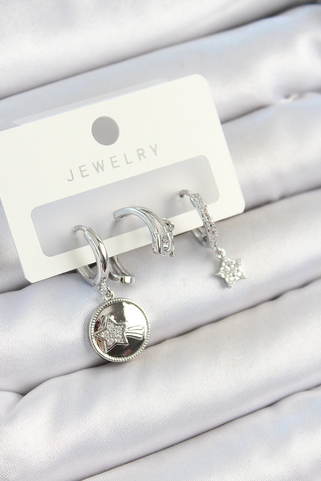 Erb Pirinç Zirkon Taşlı Sallantılı Yıldız Model Gümüş Renk 3'lü Çift Kadın Küpe Set