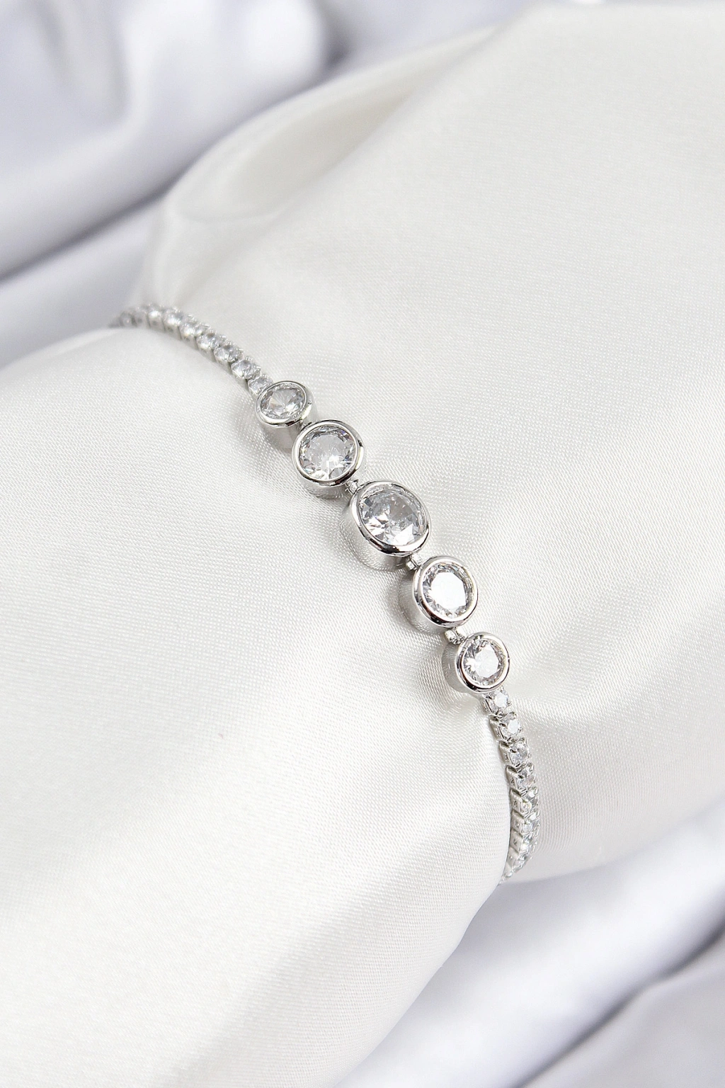 Erb Pirinç Zirkon Taşlı Sıralı Daire Model Gümüş Renk Asansörlü Kadın Bileklik