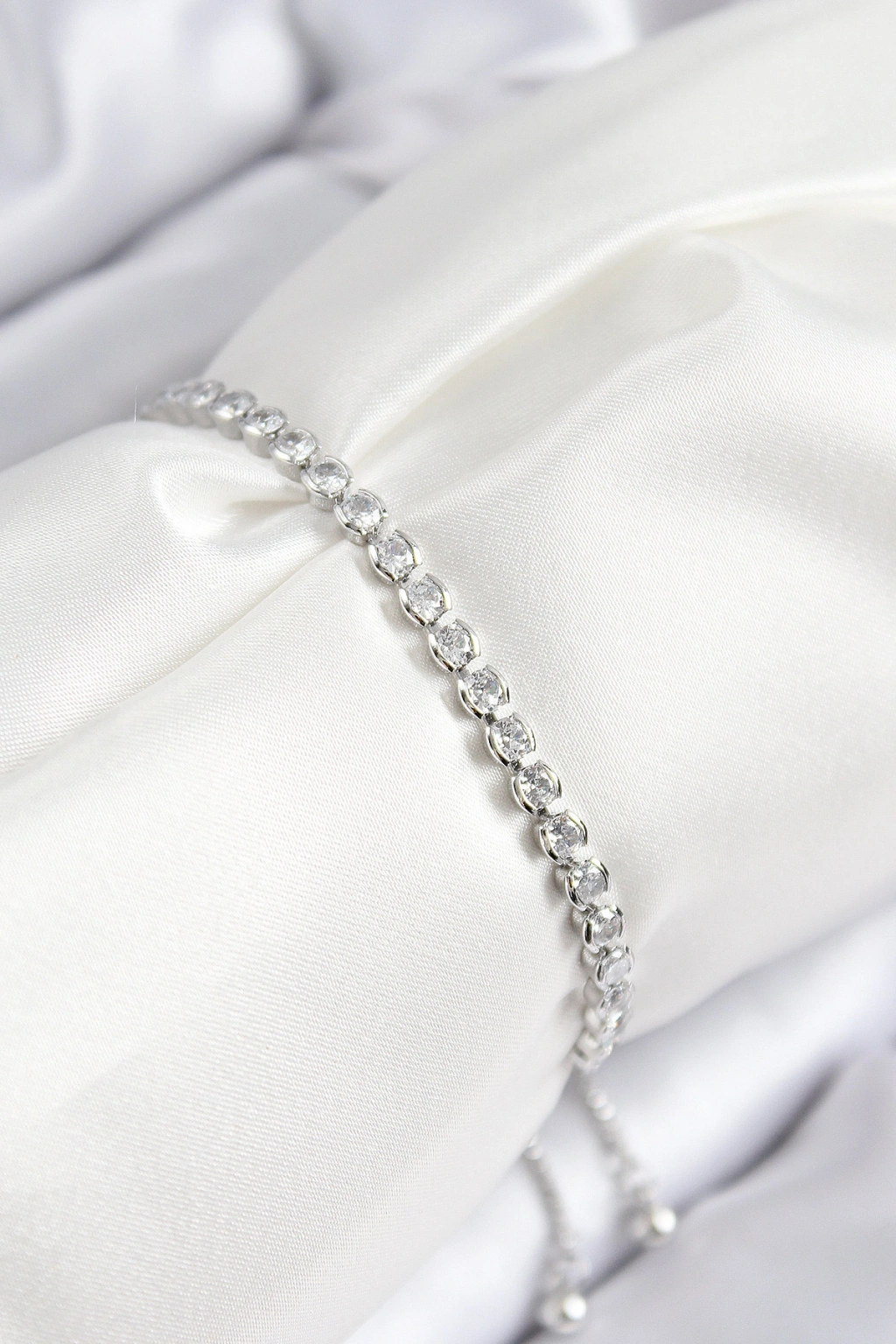 Erb Pirinç Zirkon Taşlı Sıralı Model Gümüş Renk Asansörlü Kadın Bileklik