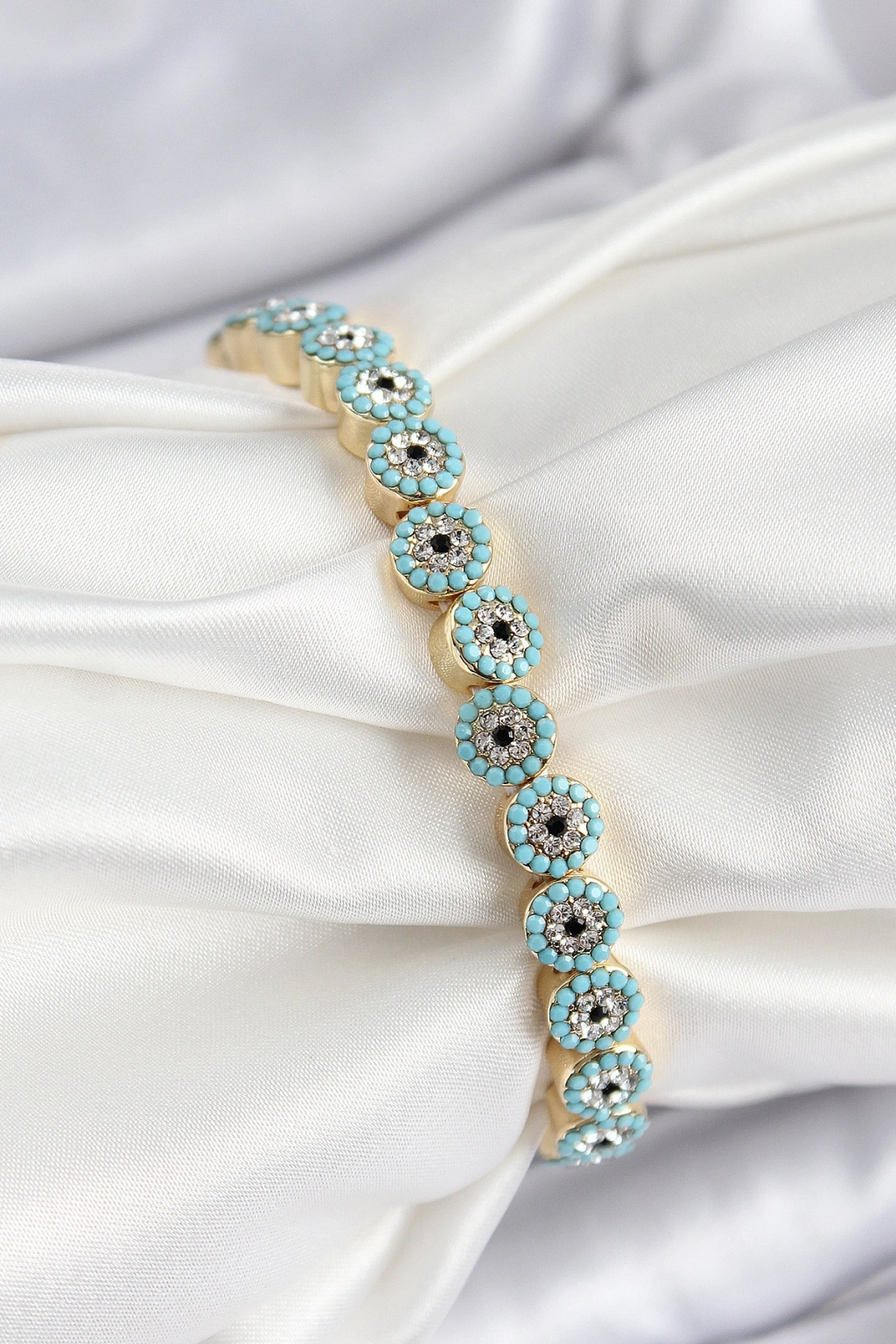 Erb Pirinç Zirkon Taşlı Turkuaz Nazar Model Gold Renk Lastikli Kadın Bileklik