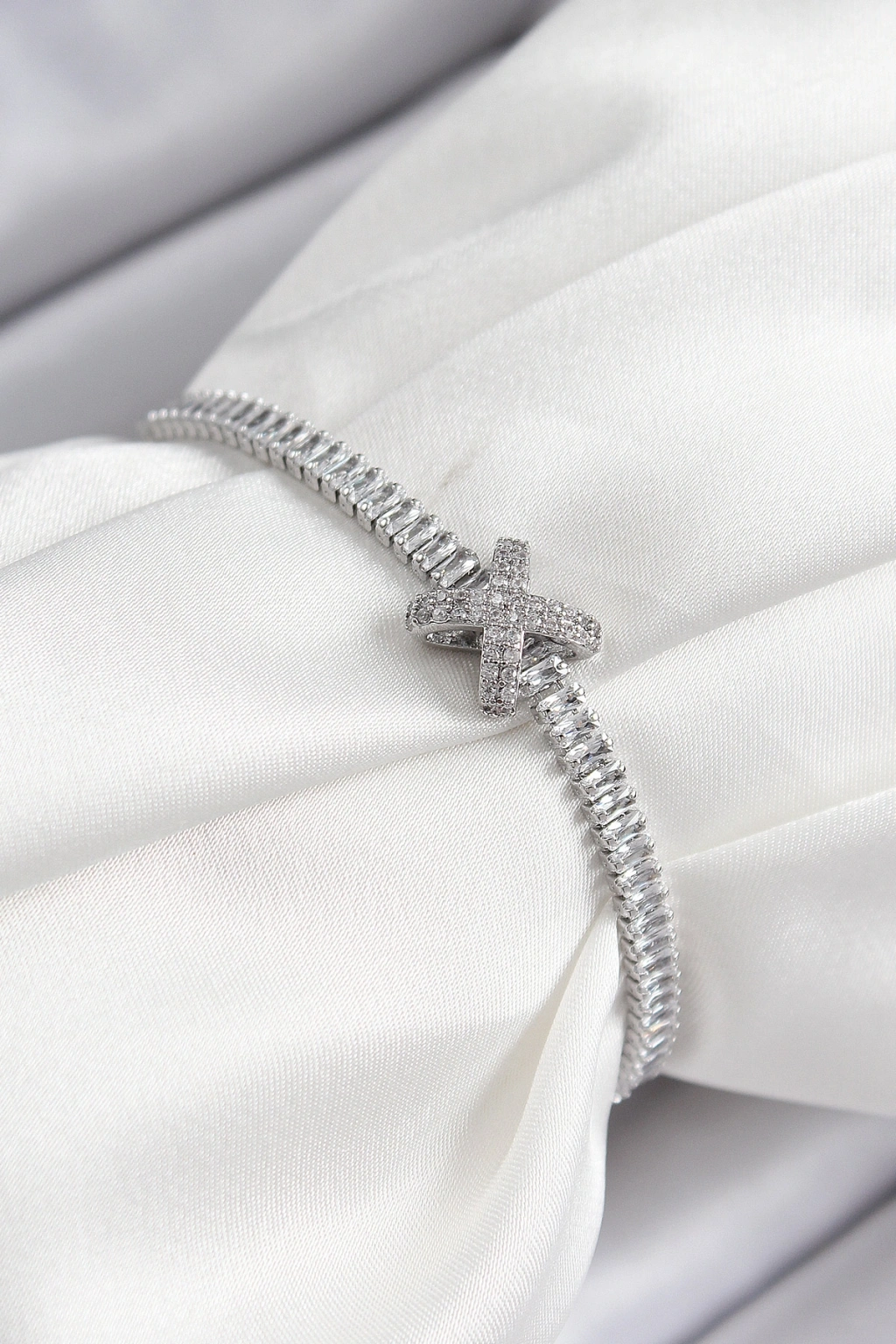 Erb Pirinç Zirkon Taşlı X Detaylı Su Yolu Model Gümüş Renk Asansörlü Kadın Bileklik