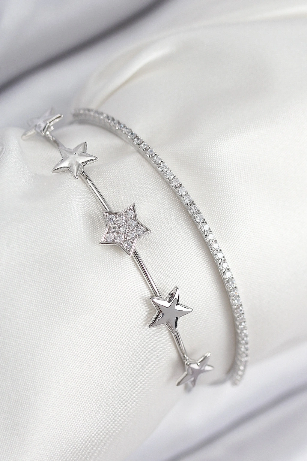 Erb Pirinç Zirkon Taşlı Yıldız Model Gümüş Renk Kadın Bileklik