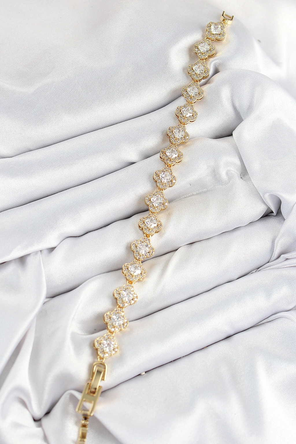 Erb Pirinç Zirkon Taşlı Yonca Baget Model Gold Renk VIP Seri Kadın Bileklik