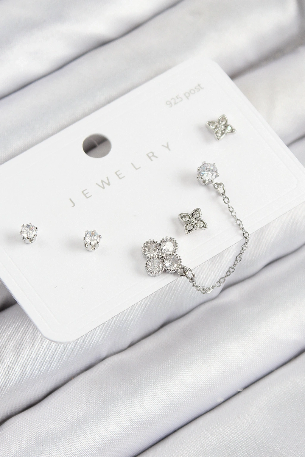 Erb Pirinç Zirkon Taşlı Yonca Model Gümüş Renk 925 Ayar Gümüş Çivi Kadın Küpe Set