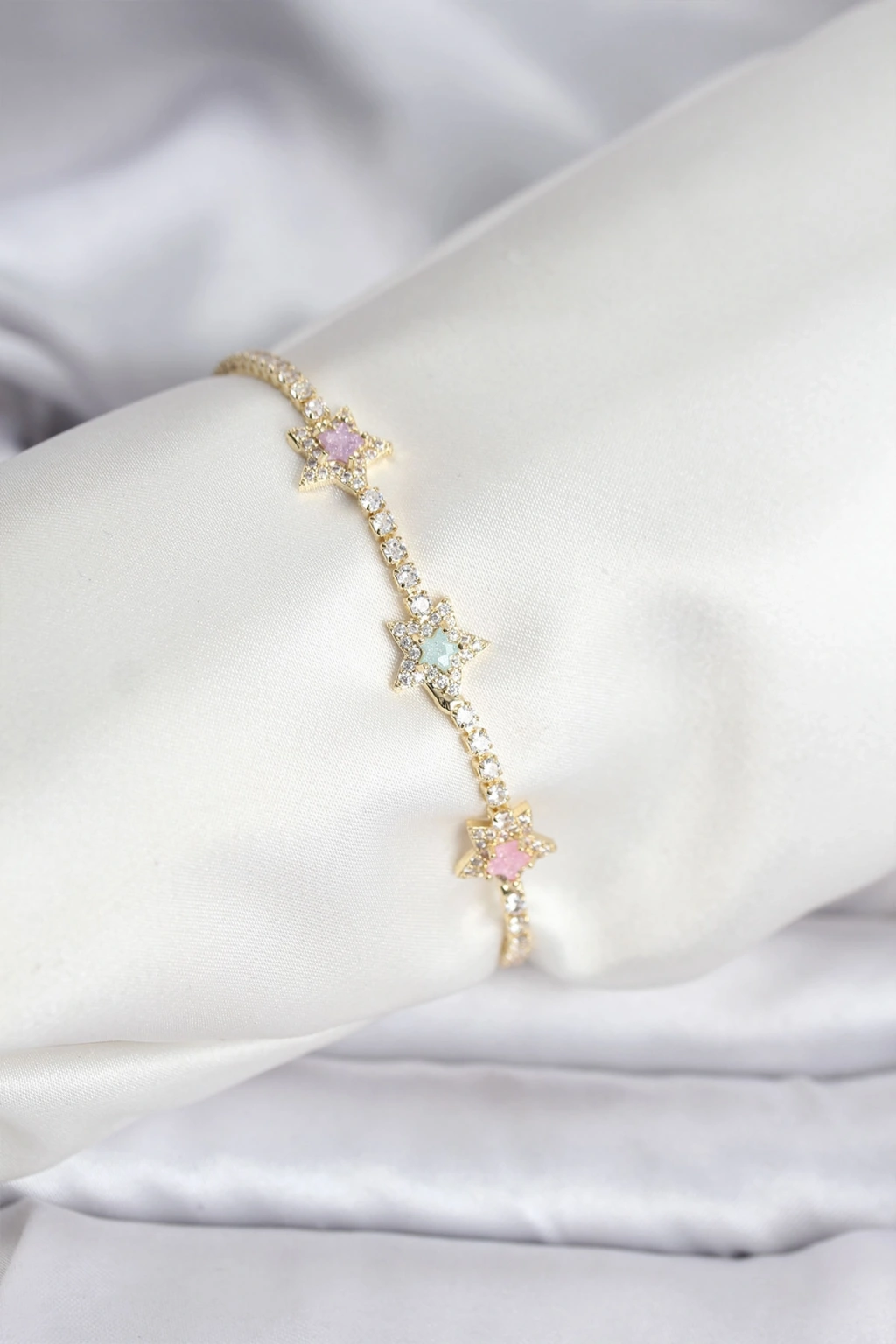 Erb Renkli Yıldız Model Zirkon Taşlı Gold Renk Pirinç Su Yolu Kadın Bileklik