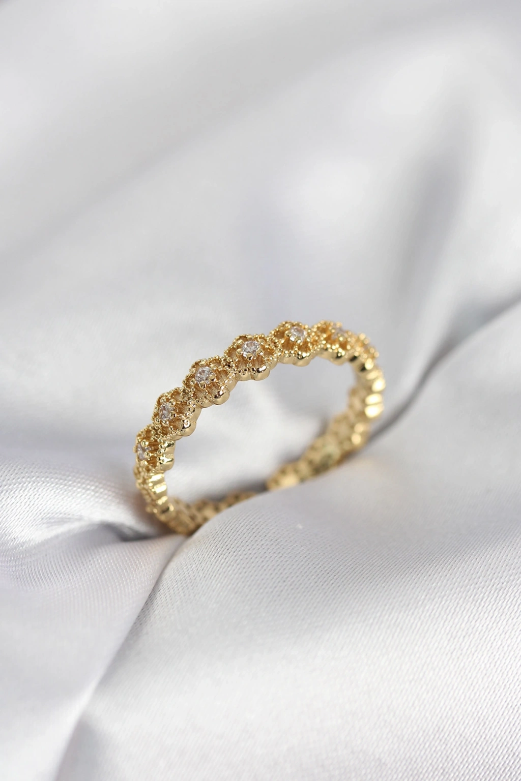 Erb Sıralı Çiçek Model Gold Renk Zirkon Taşlı Kadın Yüzük