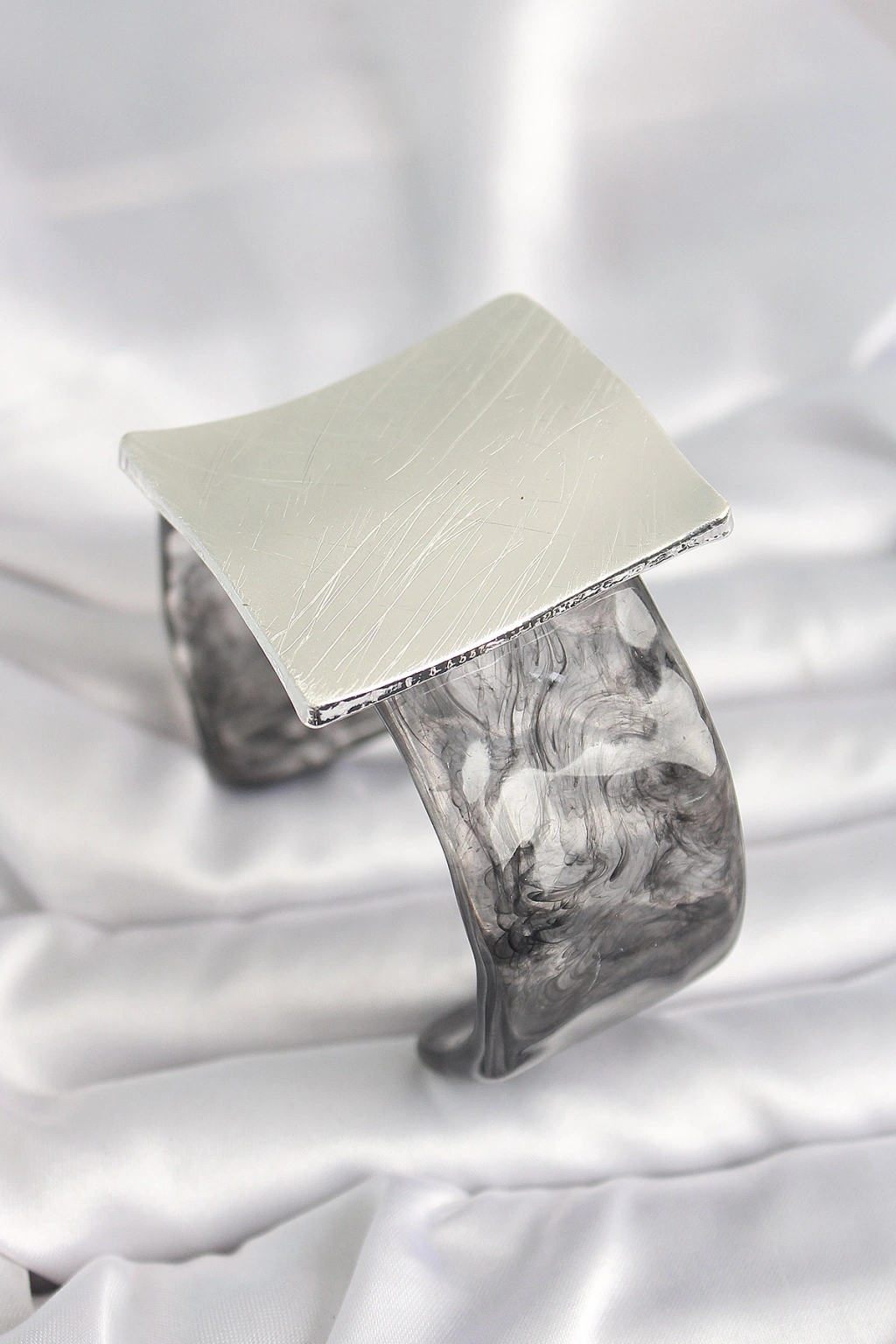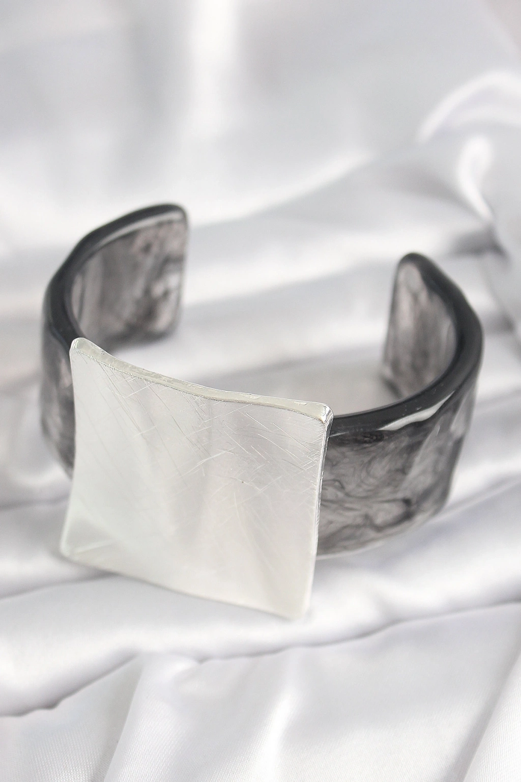 Erb Siyah Mermer Desen Akrilik Plastik Gümüş Kare Plaka Model Vintage Kadın Bilezik