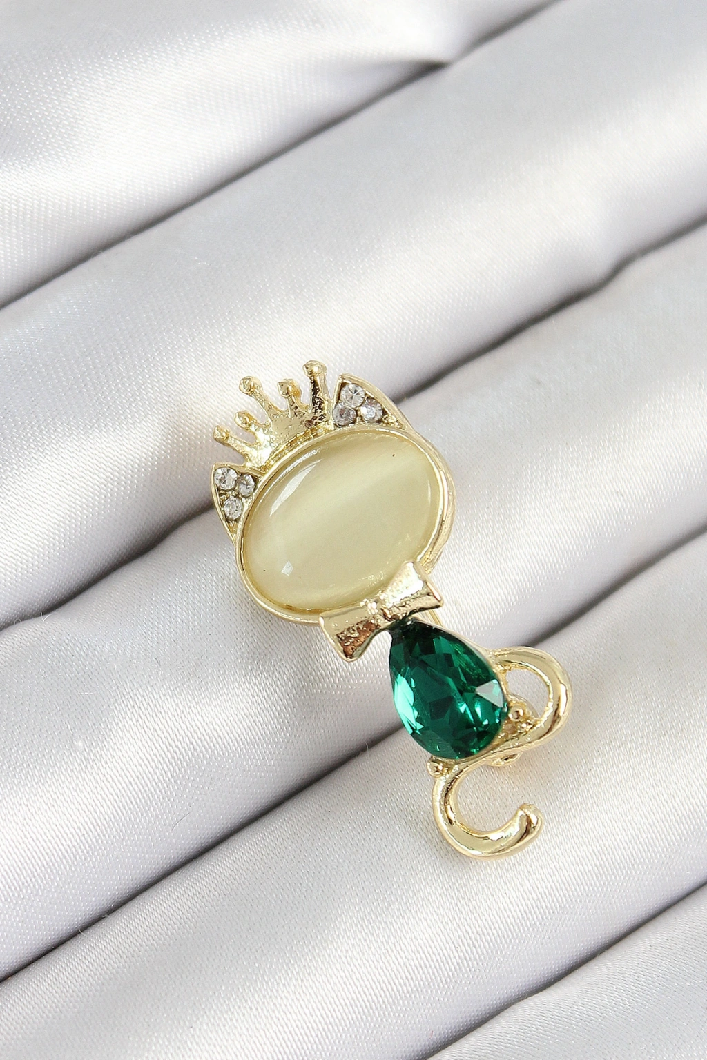 Erb Yeşil Damla Zirkon Taşlı Kraliçe Taçlı Kedi Figürlü Gold Renk Kadın Broş