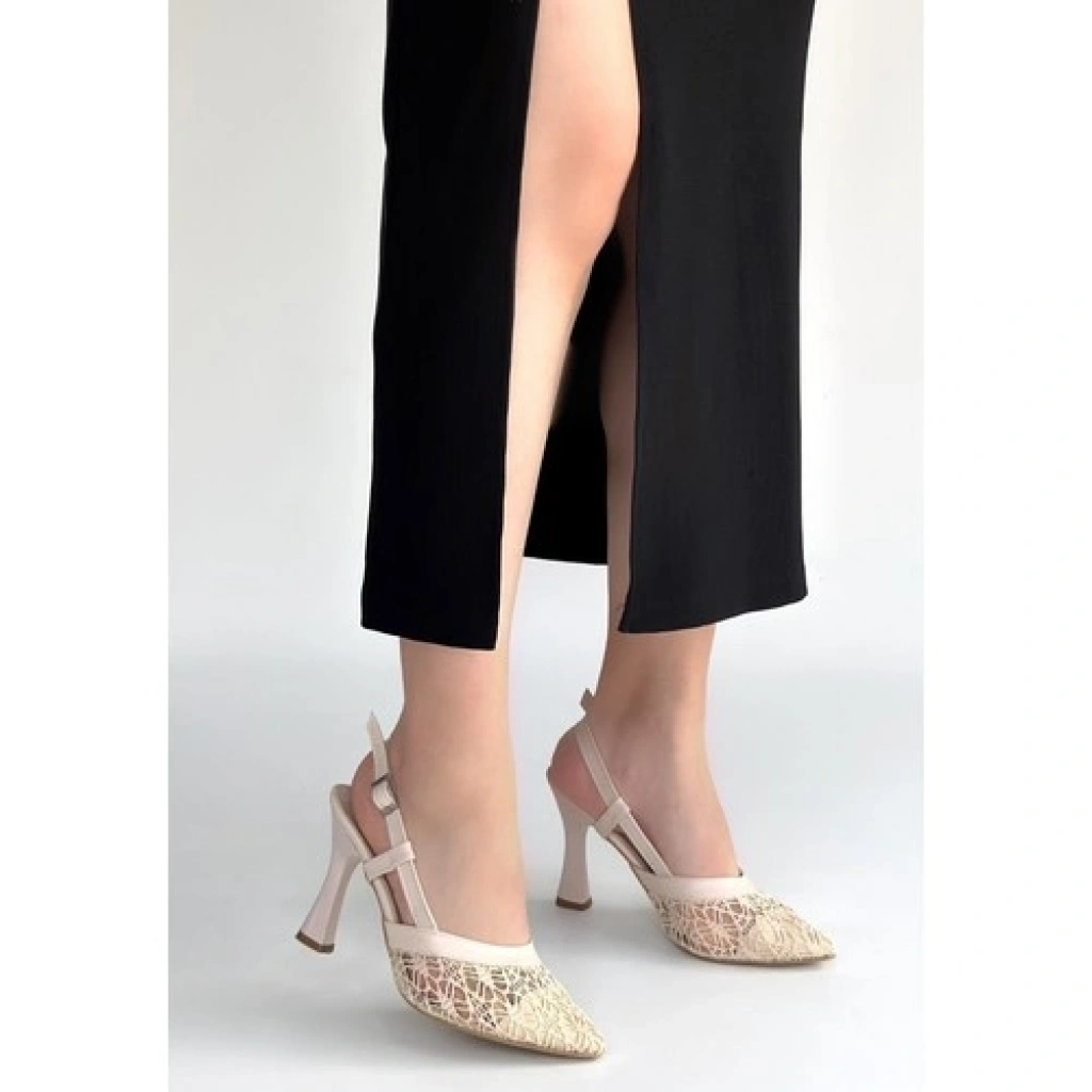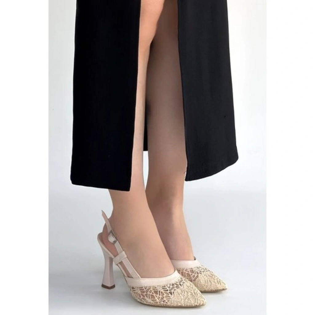 Erbilden Ceta Bej Cilt Tül Detaylı Topuklu Ayakkabı