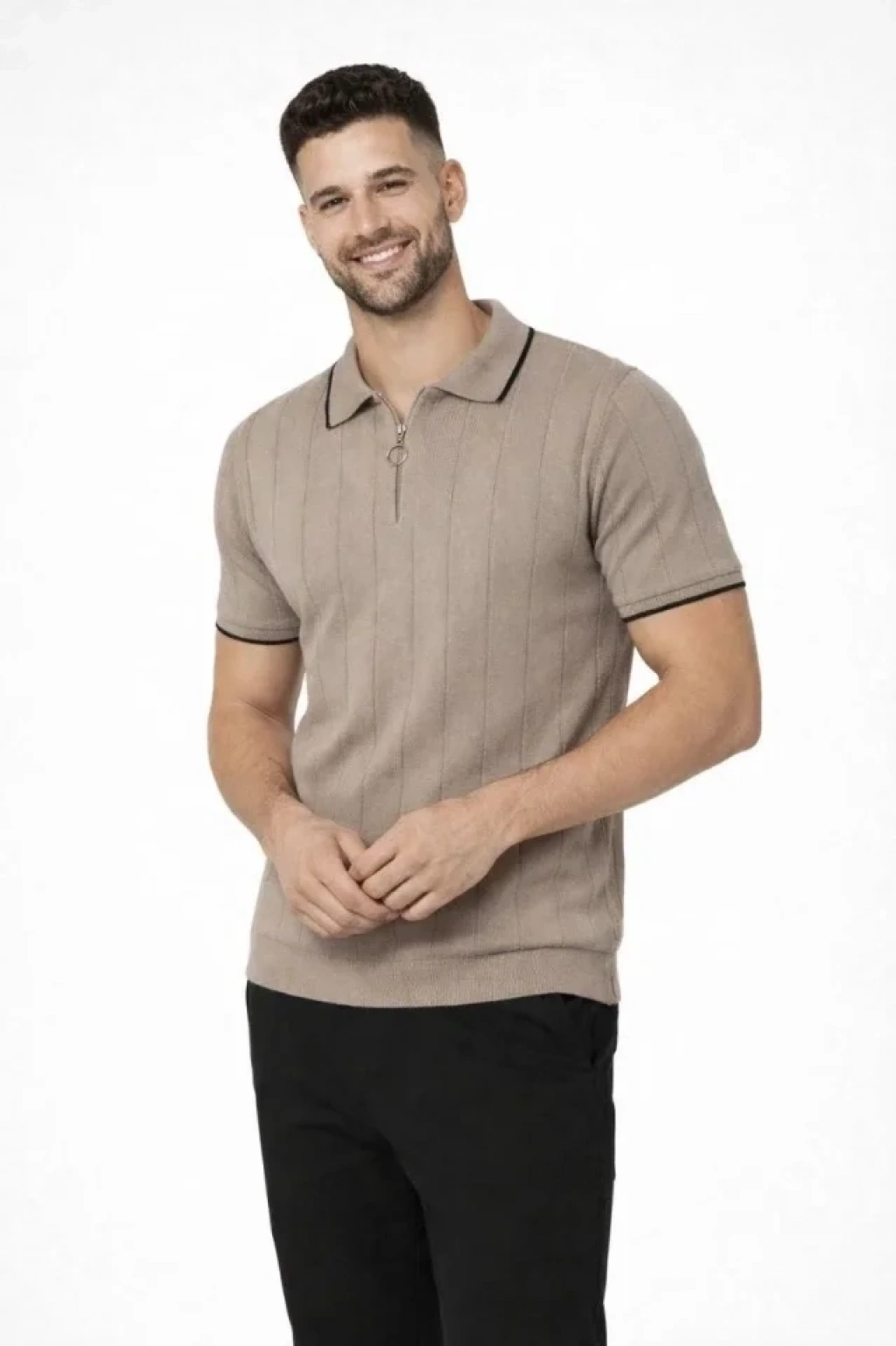 Erkek 3’lü Paket Dokuma Triko  Fermuarlı Yakalı Fitilli Kısa Kollu Regular Fit Tişört - Kahverengi, Beyaz, Siyah
