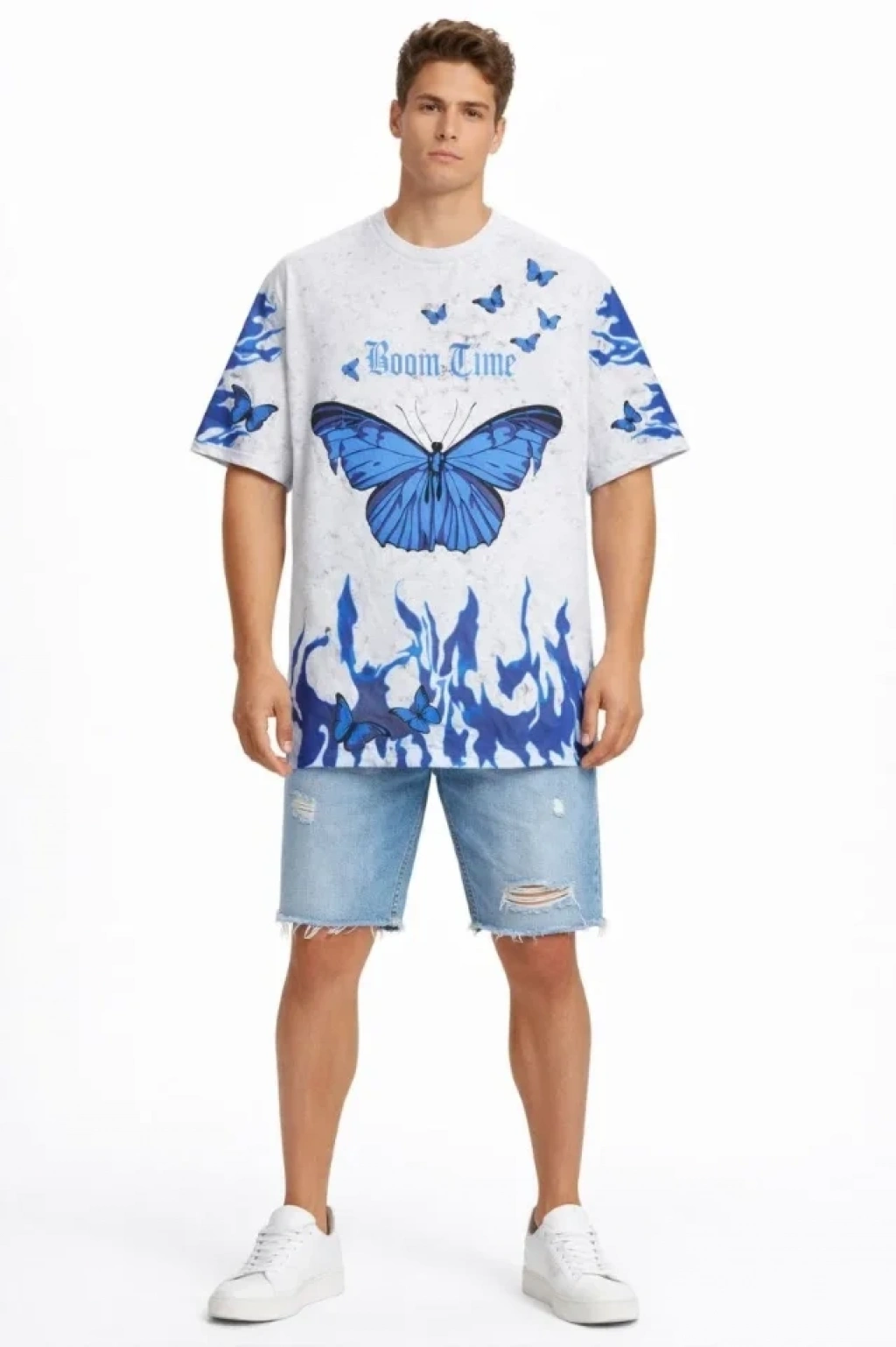 Erkek Asit Yıkamalı Oversize Tişört Mavi Kelebek Baskılı Dijital Print Bisiklet Yaka Streetwear T-Shirt - Beyaz