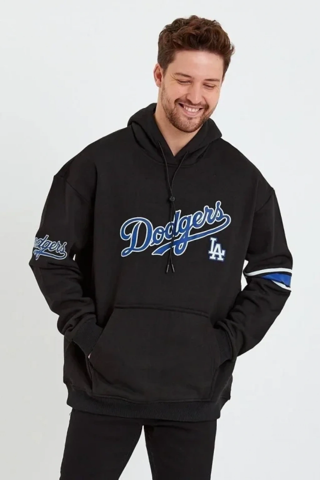 Erkek Şeritli Kapüşonlu Sweatshirt Oversize 3 Iplik Pamuklu - Siyah