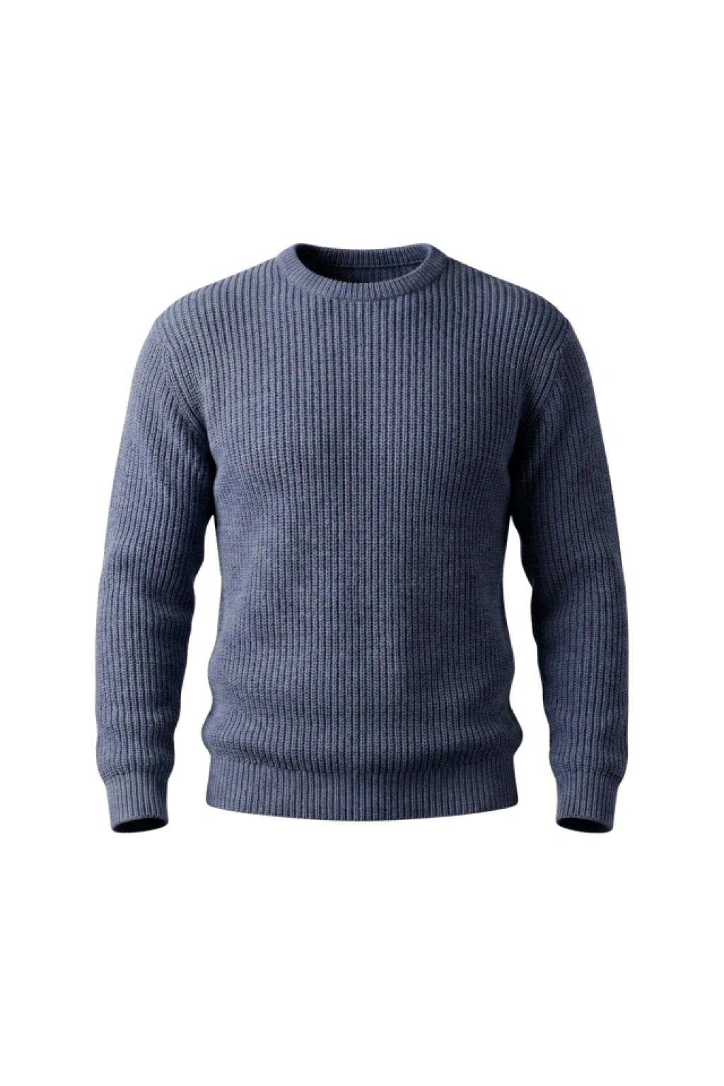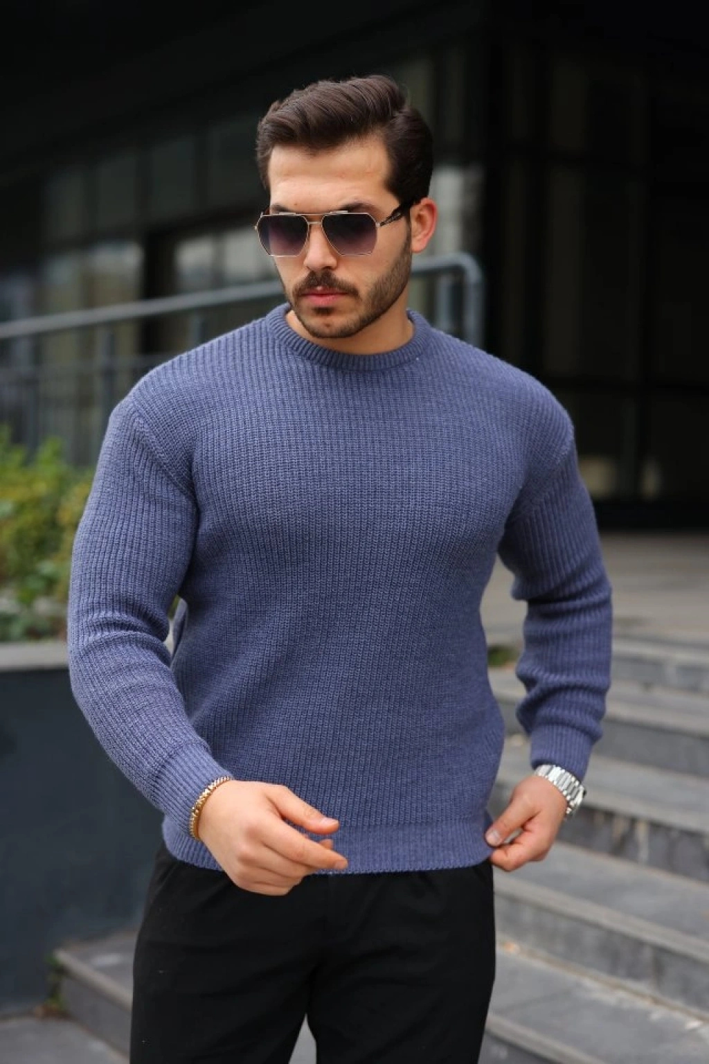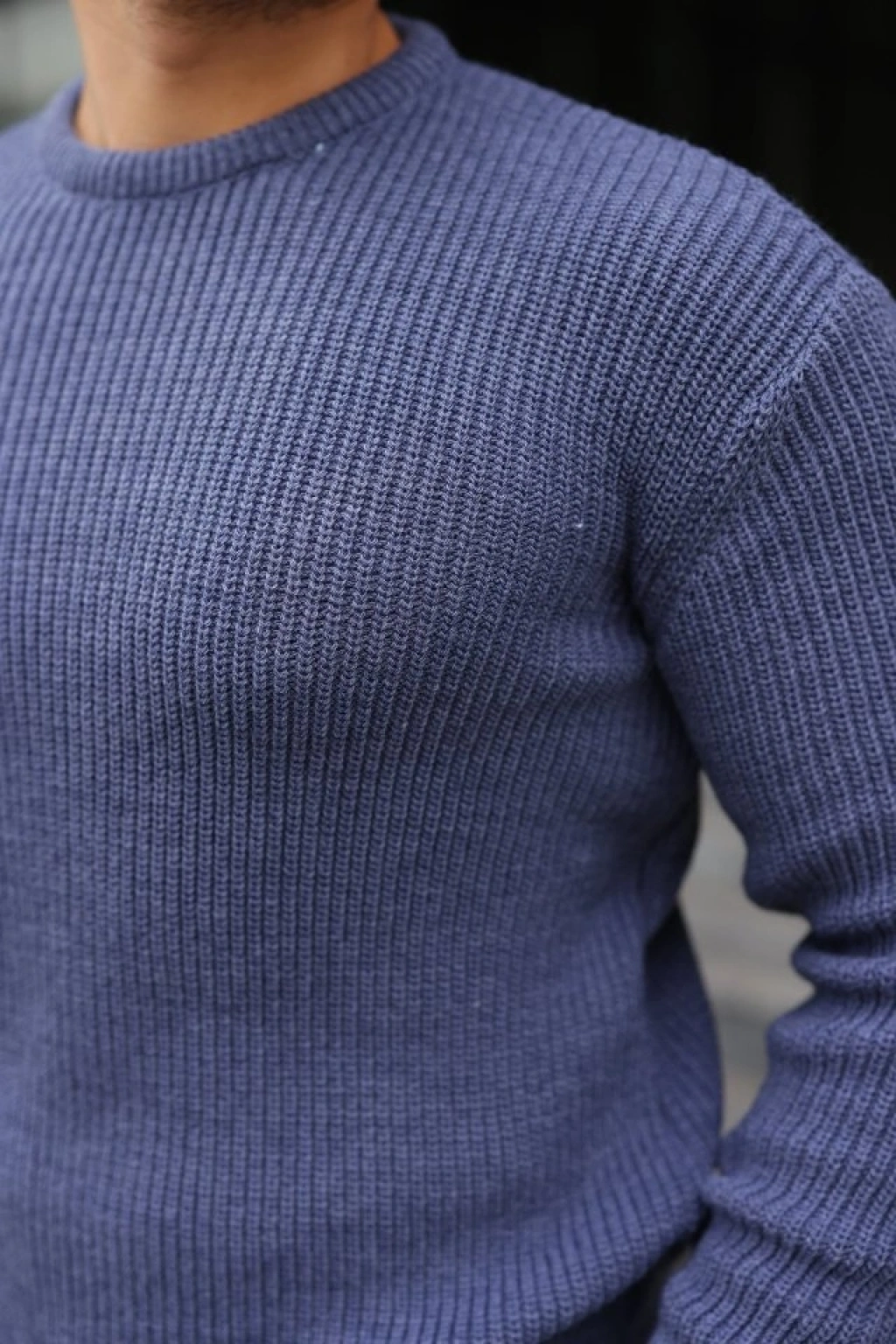 Erkek Bisiklet Yuvarlak Yaka Triko Kazak Pamuklu Kalın Fitilli Dokuma, Regular Fit Uzun Kollu Kışlık Model - Gri