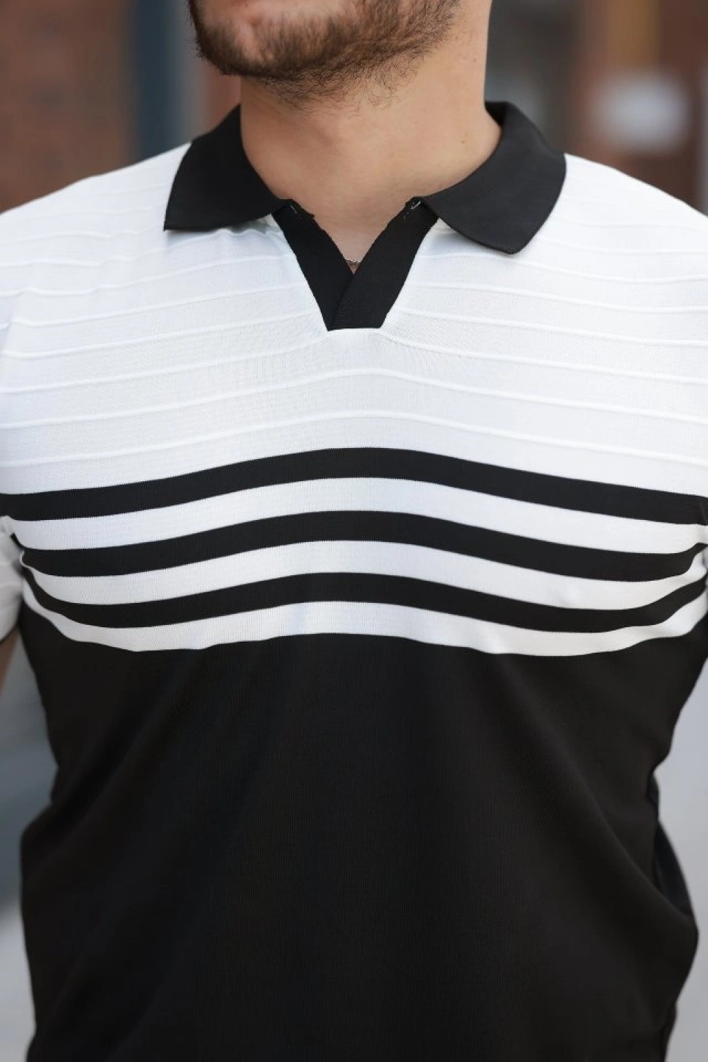 Erkek T-shirt Çizgili Triko Dokuma Kumaş Polo Yaka Yarım Fermuarlı Regular Kalıp Tişört - Siyah