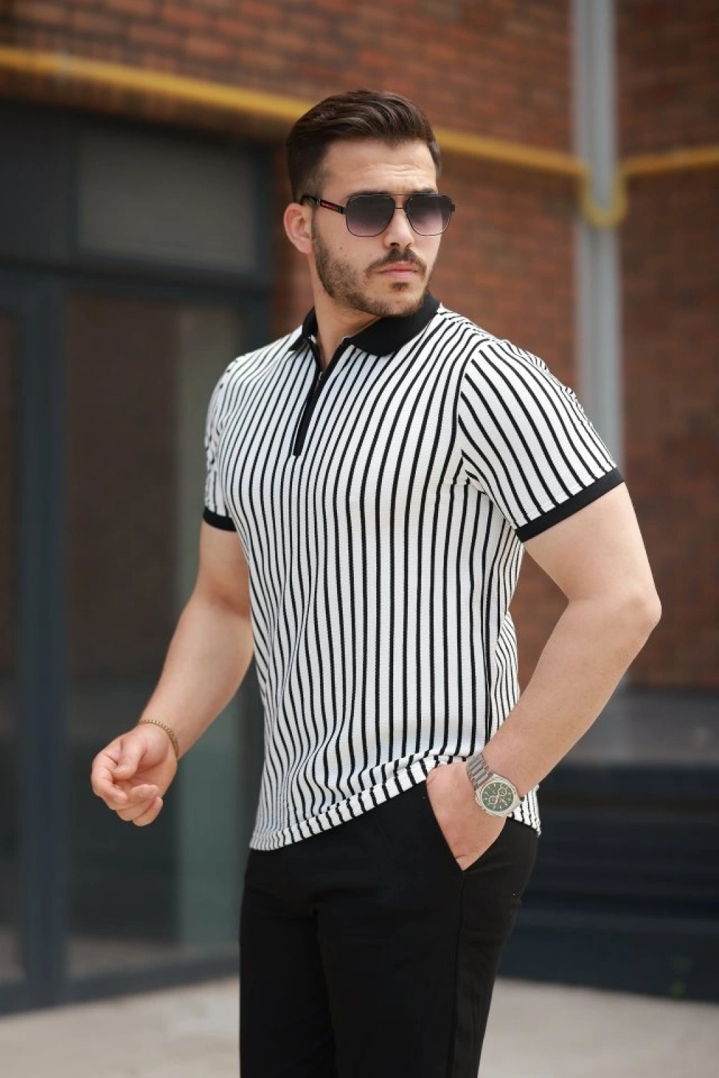 Erkek çizgili Fermuar Yakalı Kısa Kollu Tişört