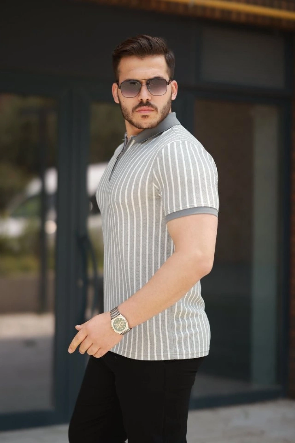Erkek çizgili Fermuar Yakalı Kısa Kollu Tişört
