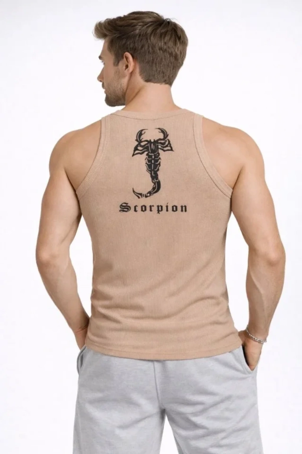 Erkek Fitilli Atlet Sıfır Yaka Slim Fit Arka Baskılı Spor Atlet - Bej