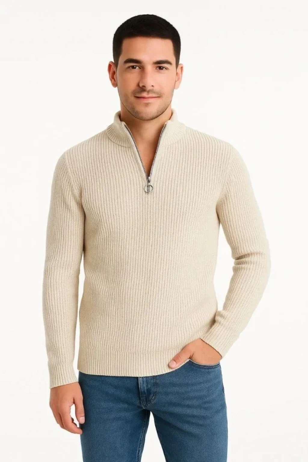 Erkek Fitilli Triko Kazak 2’li Set – Siyah - Bej Kalın Dokuma Pamuklu Regular Fit V Yaka Fermuarlı Uzun Kollu Rahat Kışlık Kazak Kombini