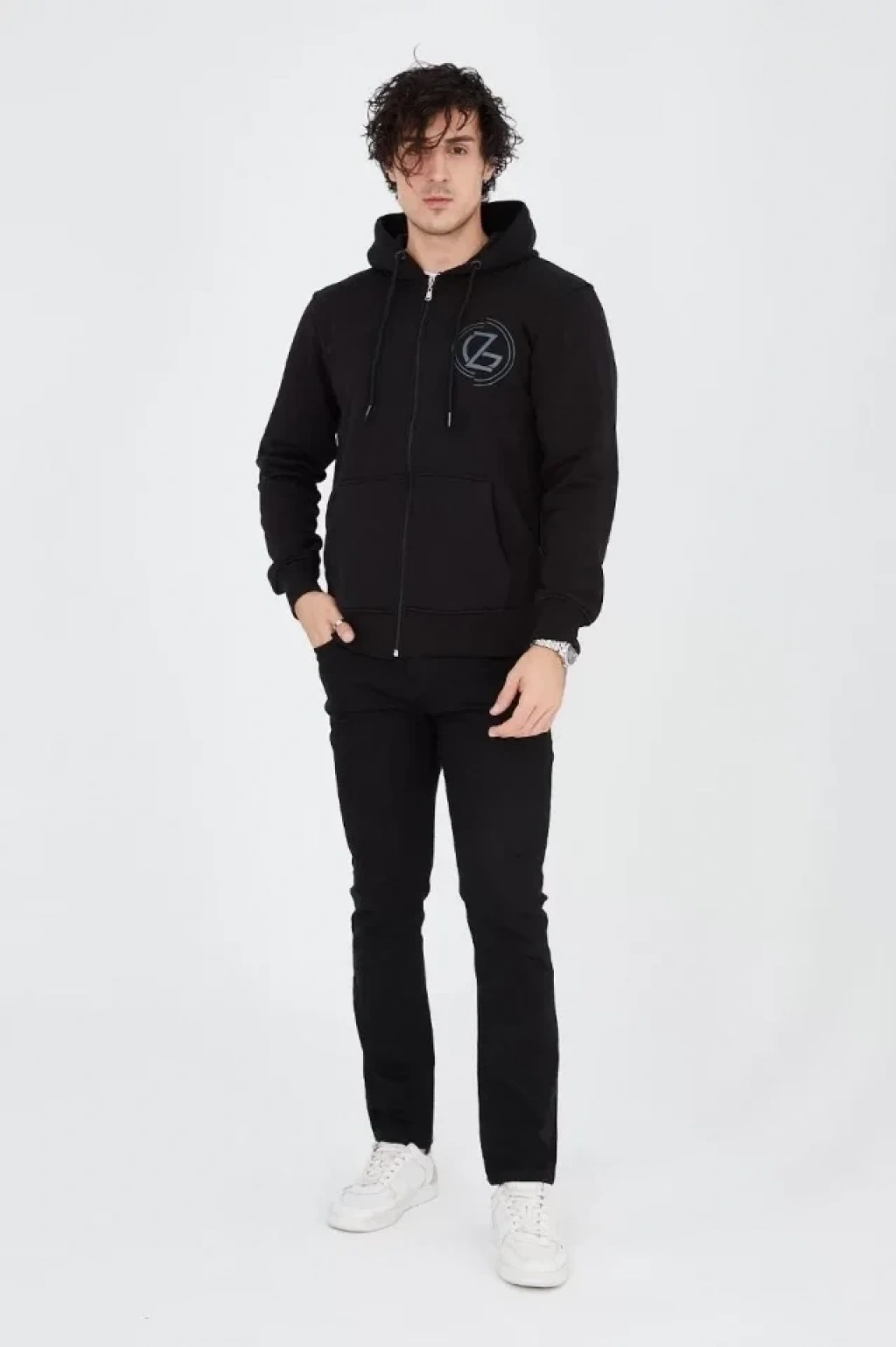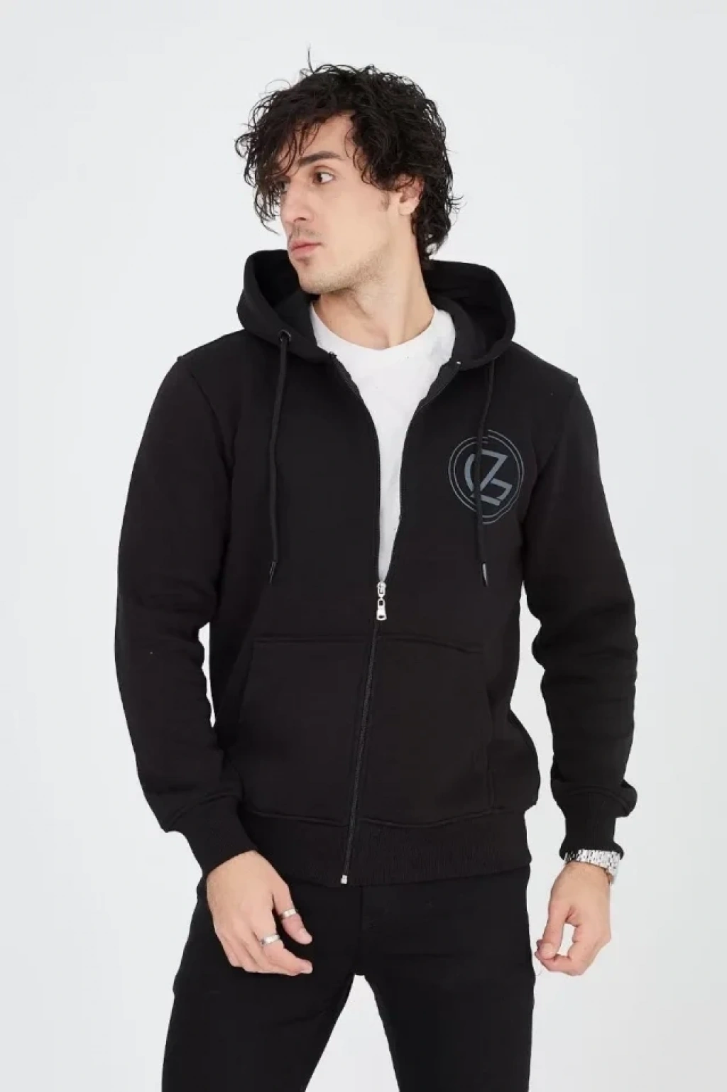 Erkek Kapüşonlu Baskılı Fermuarlı Hırka - Siyah