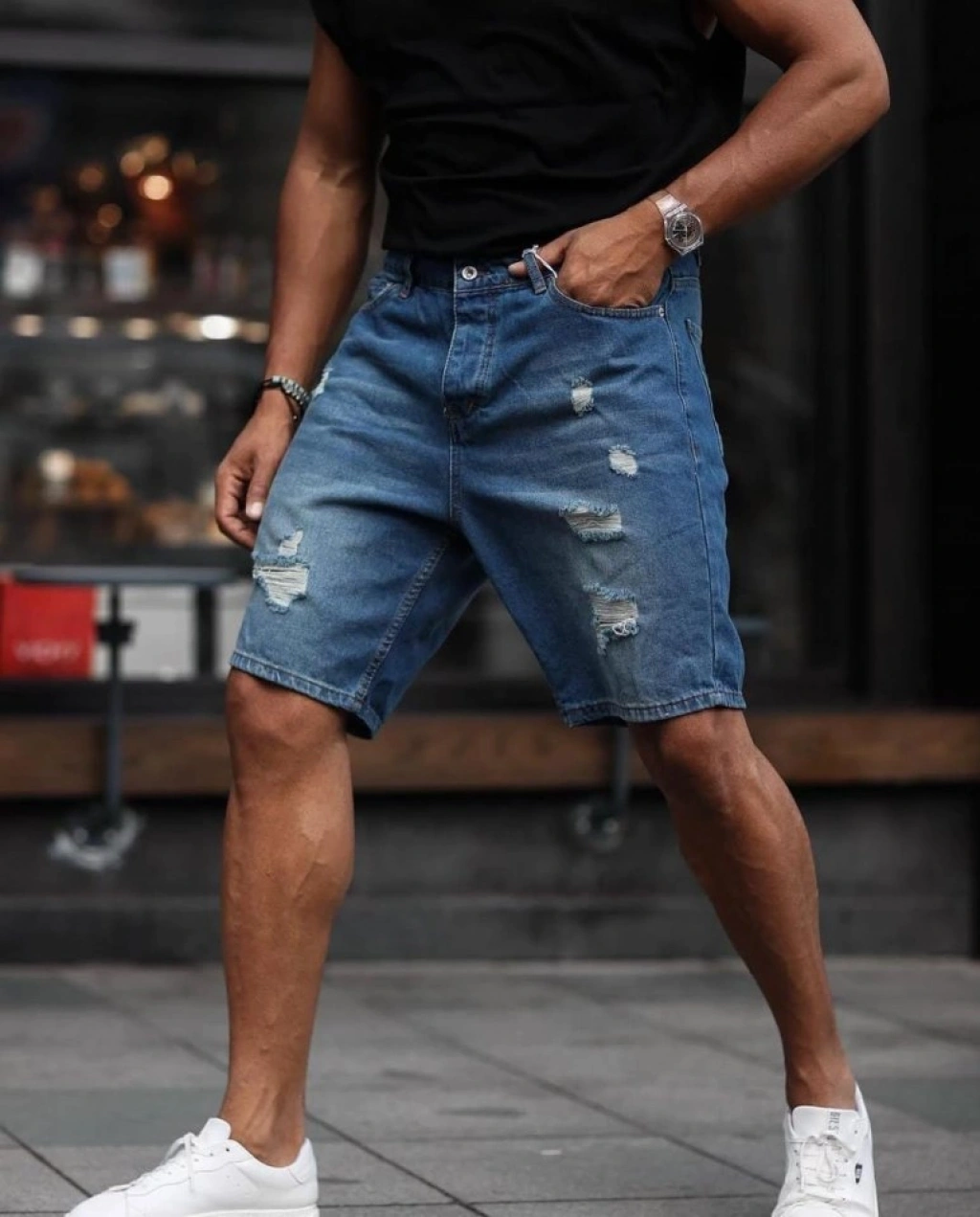 Erkek Mavi Yırtık Detaylı Şort