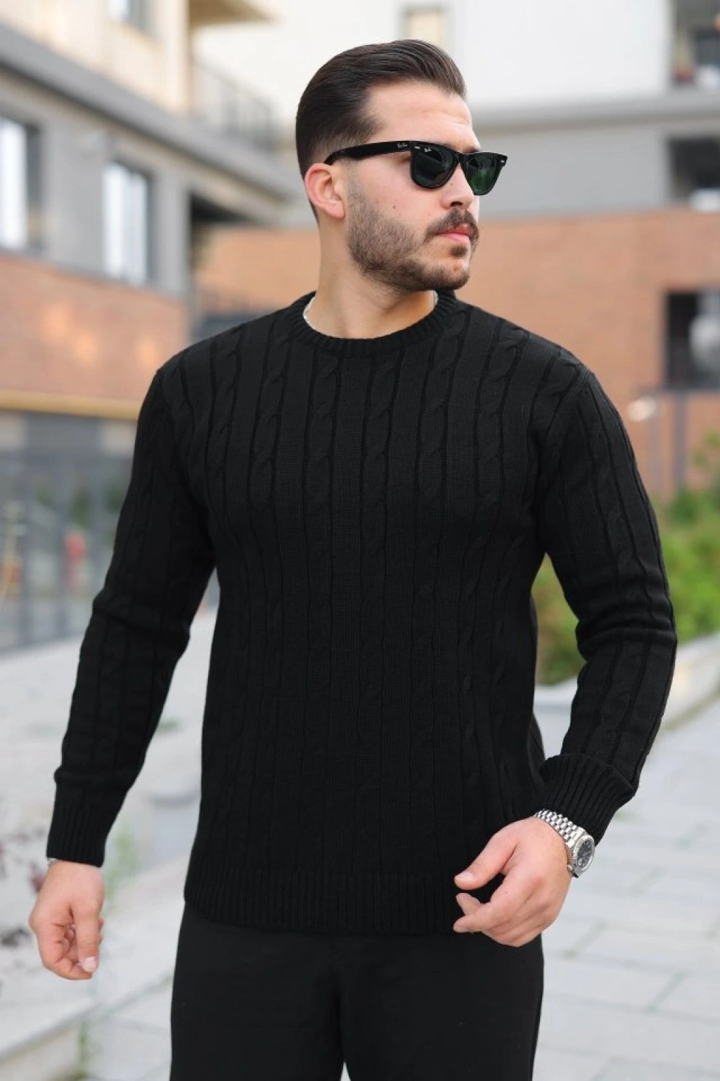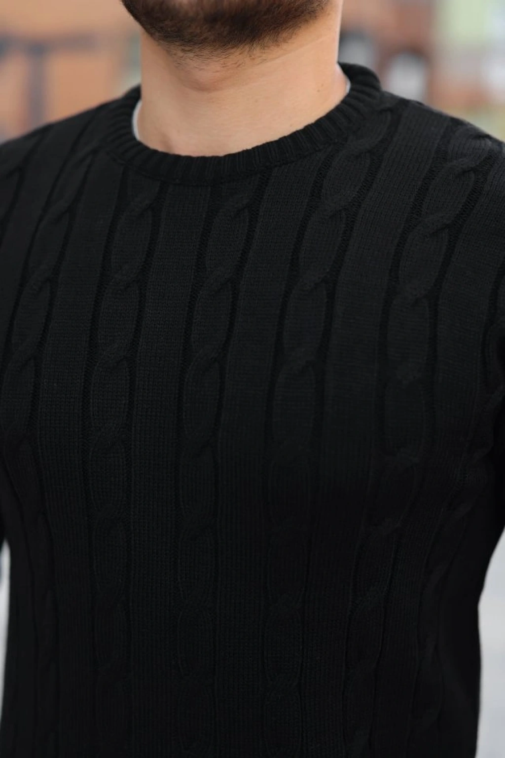 Erkek V Yaka Örgülü Kazak - Siyah