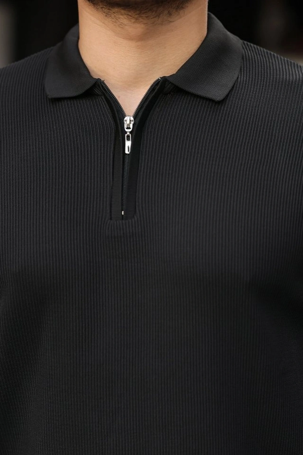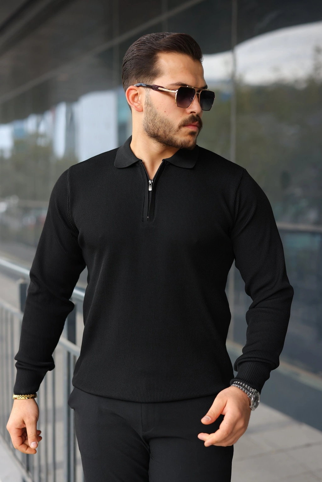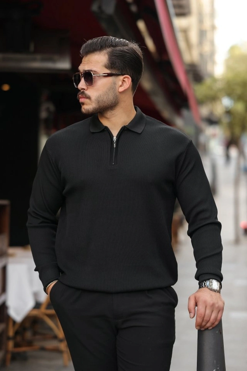 Erkek Fermuarlı Bisiklet Yaka Dokulu Uzun Kollu Triko