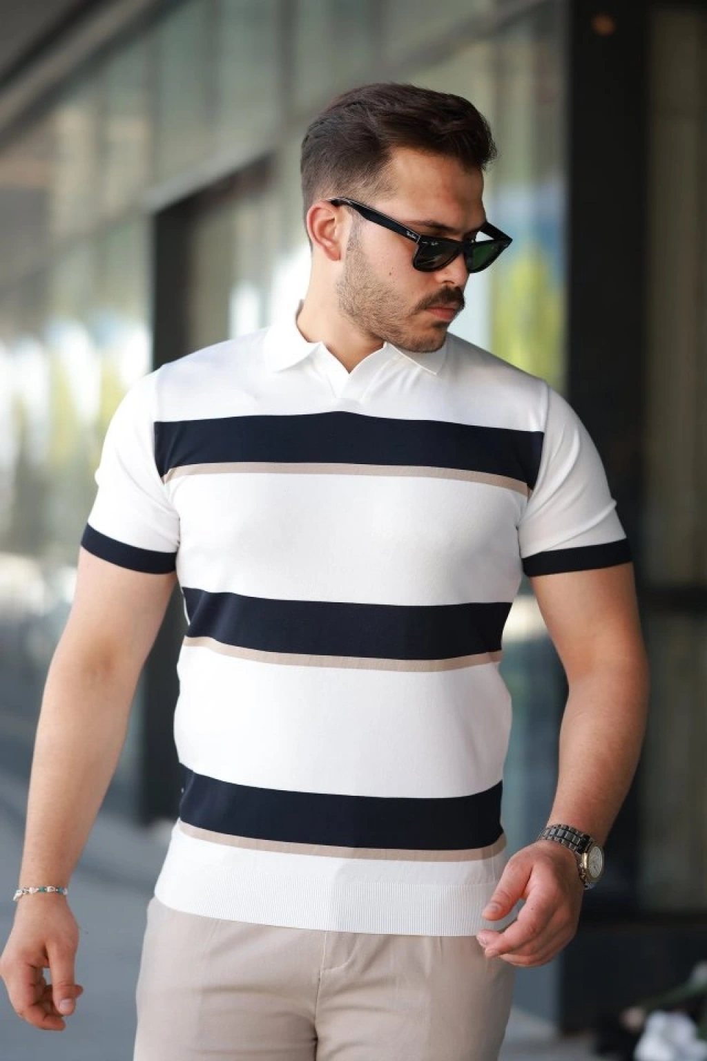 Erkek T-shirt Çizgili Triko Dokuma Kumaş Polo Yaka Yarım Fermuarlı Regular Kalıp Tişört - Siyah