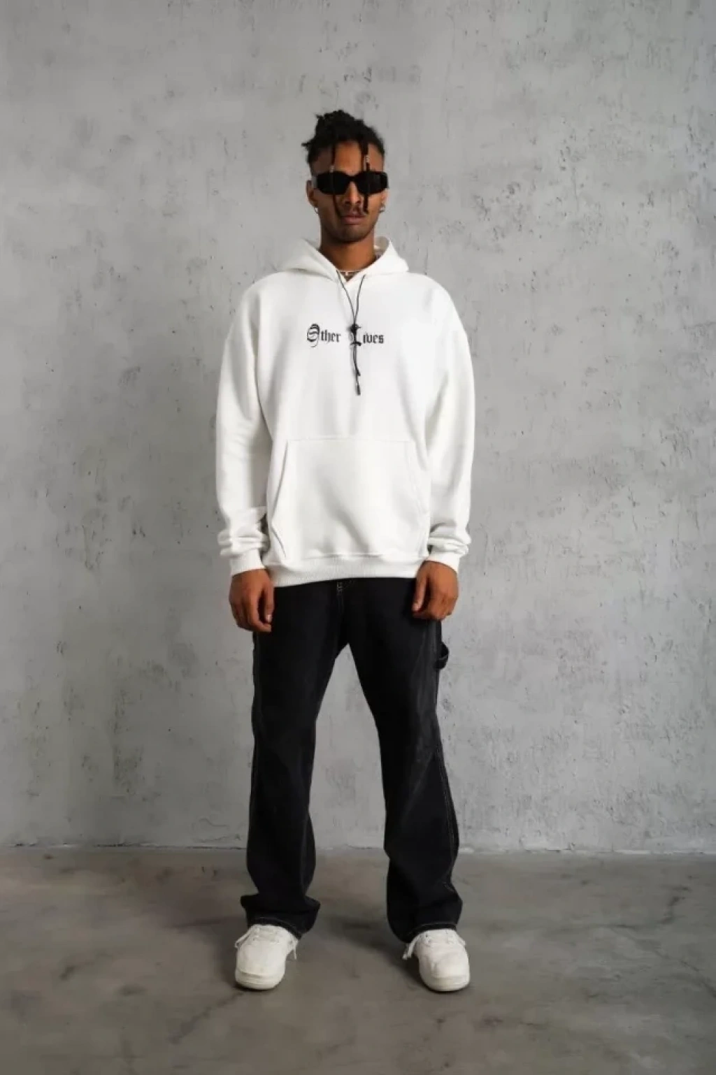 Erkek Baskılı Üç İplik Kapüşonlu Oversize Sweatshirt - Beyaz
