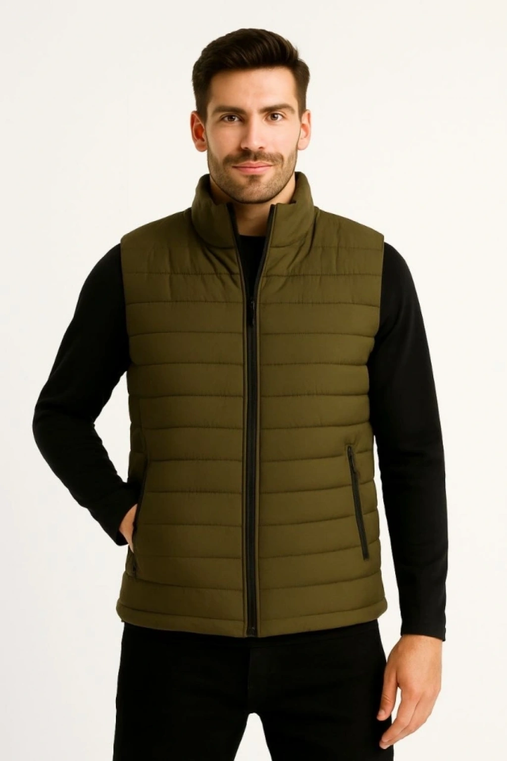 Erkek Şişme Fermuarlı Yelek Su Itici Kapitone Astarlı Kumaş Cepli Hafif Kışlık Spor Rahat Kalıp - Haki