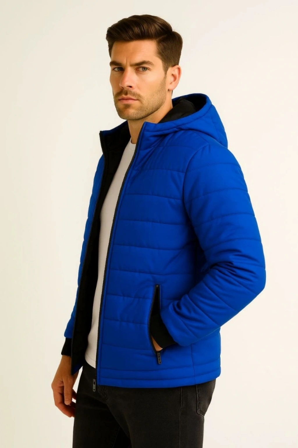 Erkek Şişme Kapüşonlu Fermuarlı Mont Su Itici Kapitone Astarlı Kumaş Cepli Kışlık Rahat Kalıp - Saks Mavisi