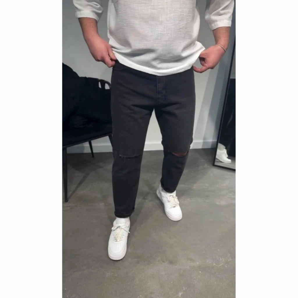 Erkek Siyah Dizi Yırtık Boyfriend Jean